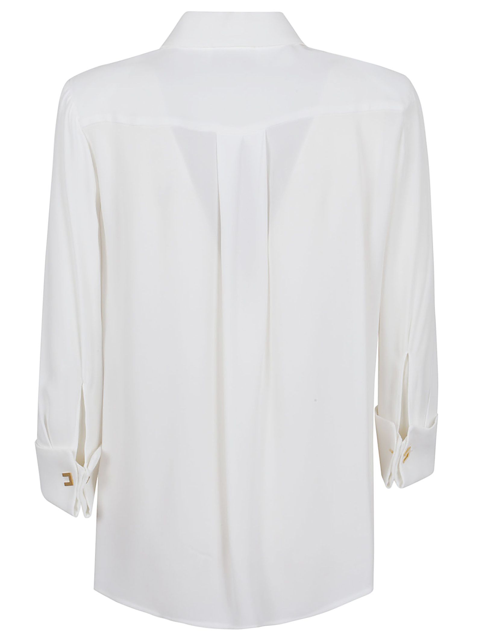 Camicia in georgette di viscosa dalla trama compatta di ELISABETTA FRANCHI.Colletto classico camicia; chiusura frontale con bottoni nascosti; spalline imbottite; design vestibilità slim. Caratterizzata da dettagli gioiello: il bottone smaltato a vista, i gemelli pendenti con catena e quelli sui polsi illuminano il capo con molteplici note preziose.