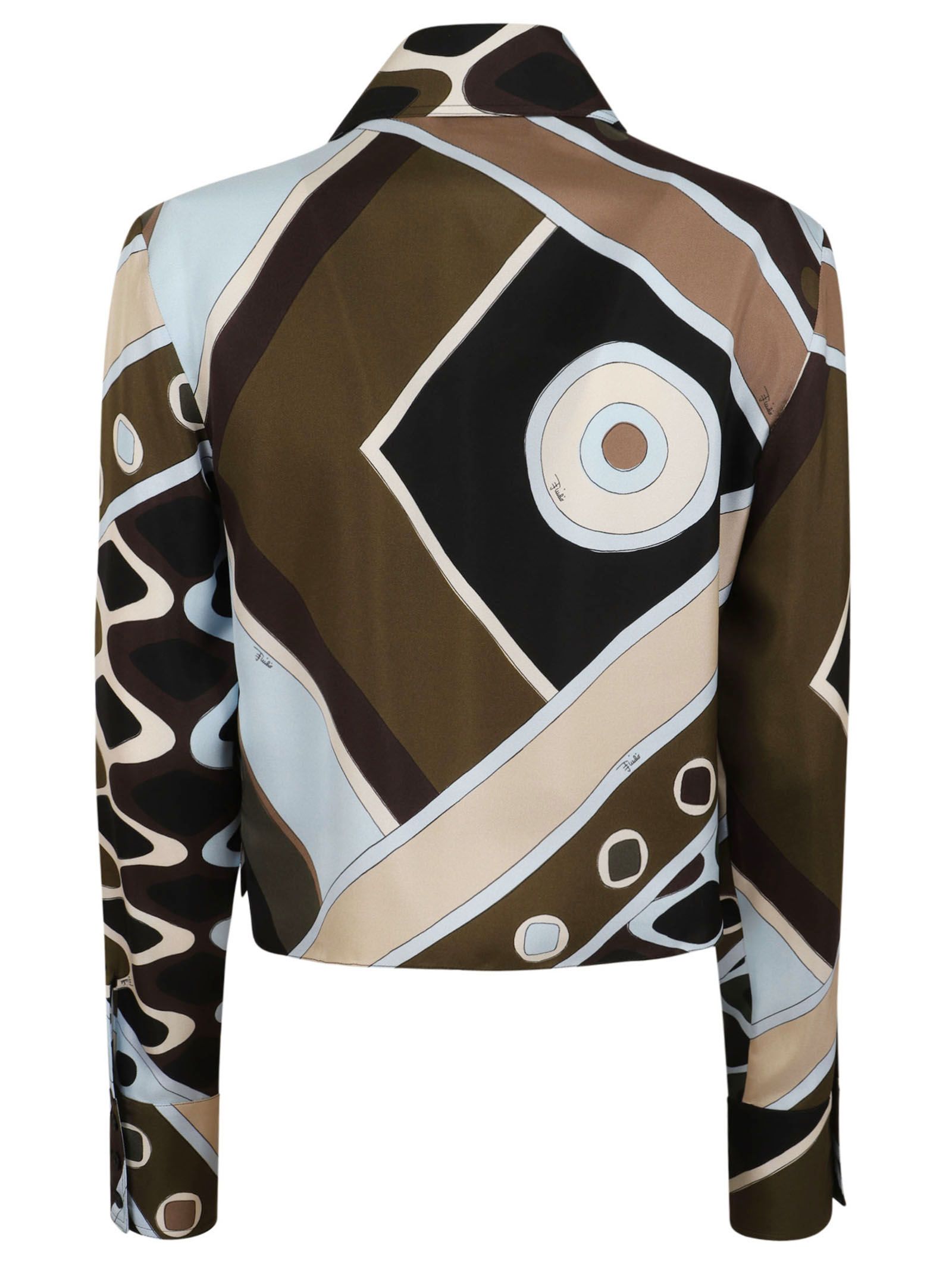 Camicia crop in seta con stampa Vivara.Modello corto con colletto a punta e maniche lunghe con polsini.Realizzata interamente in seta 100% per una silhouette fluida e leggera.Presenta la caratteristica stampa Vivara, un pattern iconico del brand che mescola motivi geometrici e forme astratte in tonalità marrone, kaki e azzurro.Chiusura frontale con bottoni a scomparsa e spacchi laterali.
