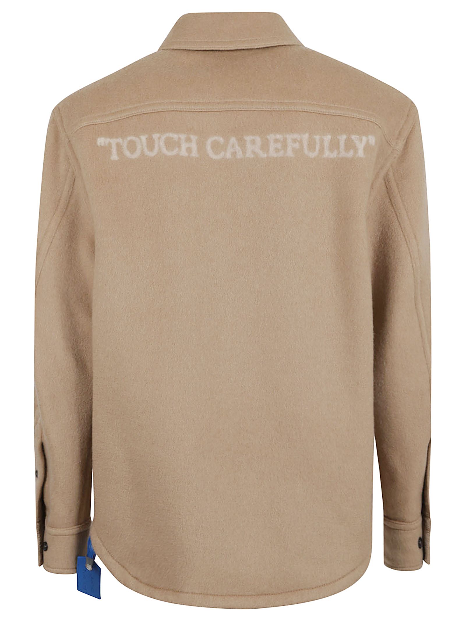 Camicia in puro cashmere di OFF WHITE.Colletto classico; chiusura con bottoni, presenti anche sui polsini; design vestibilità regolare, fondo arrotondato. Caratterizzata da Logo Off-White impresso sul petto tono su tono, scritta "TOUCH CAREFULLY" a contrasto sulla schiena e Tag interno blu.