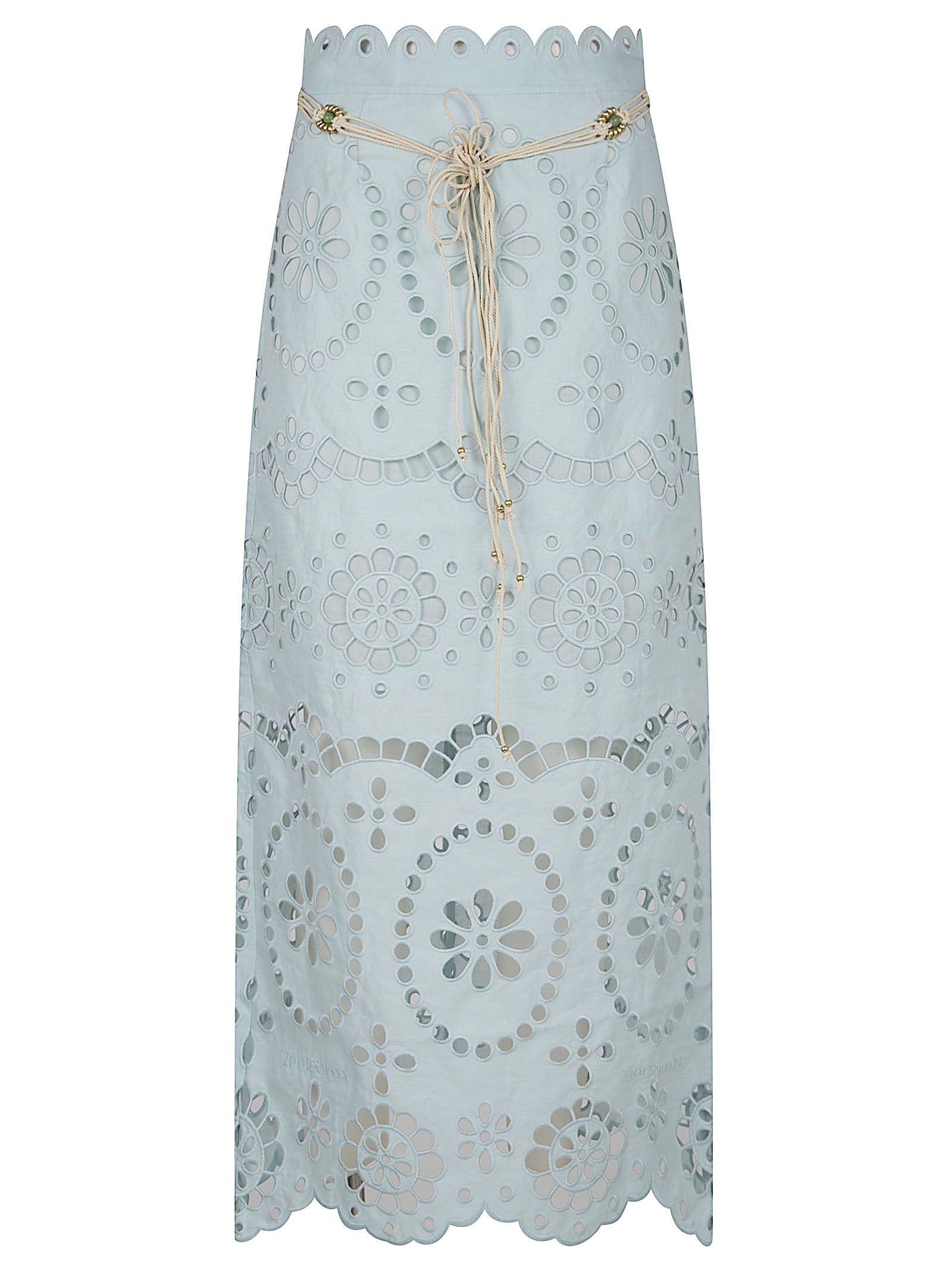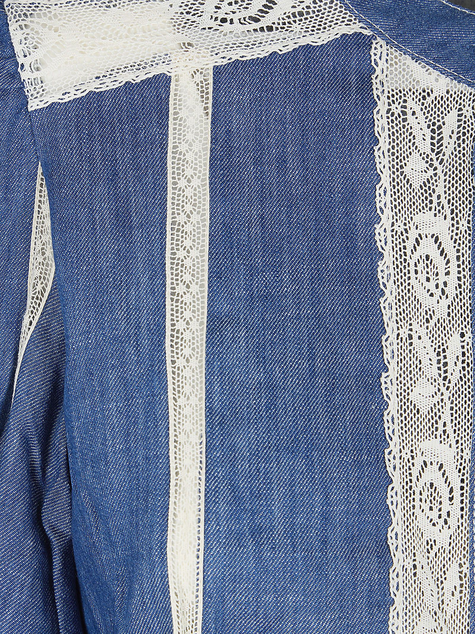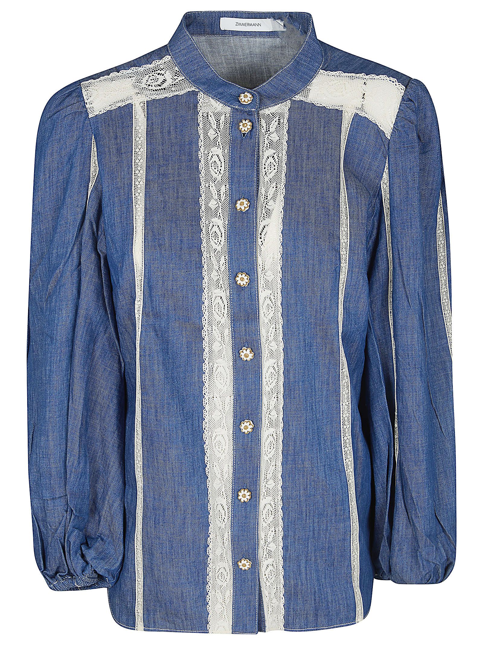 Camicia Awaken in denim di ZIMMERMANN.Maniche lunghe a sbuffo, polsini con elastici e arricciatura sulle spalle; colletto rialzato; chiusura con bottone singolo; design vestibilità slim fit. Caratterizzata da inserti in pizzo.