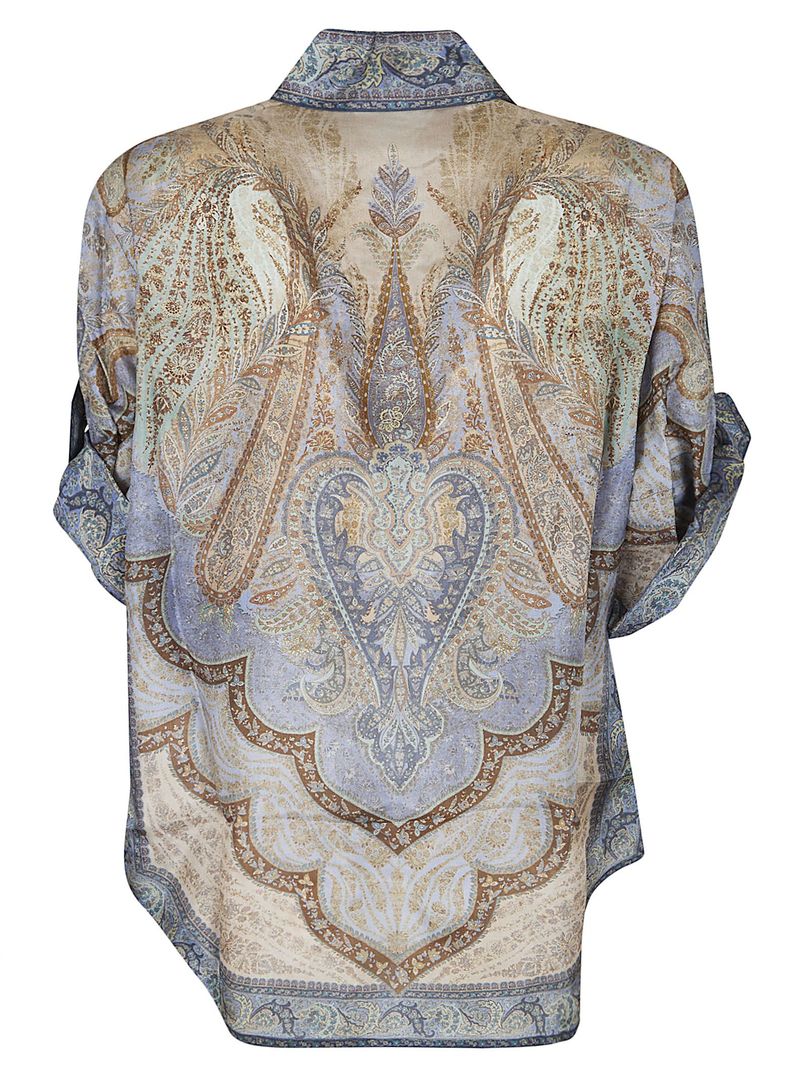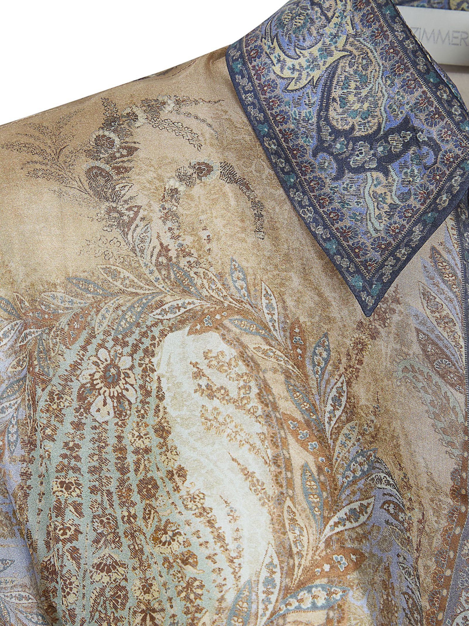 Camicia Wanderlust in seta di ZIMMERMANN.Colletto dal taglio classico; chiusura con bottoni al centro sul davanti; maniche corte con fondo manica arrotolato con linguette; design vestibilità morbida, orlo asimmetrico.