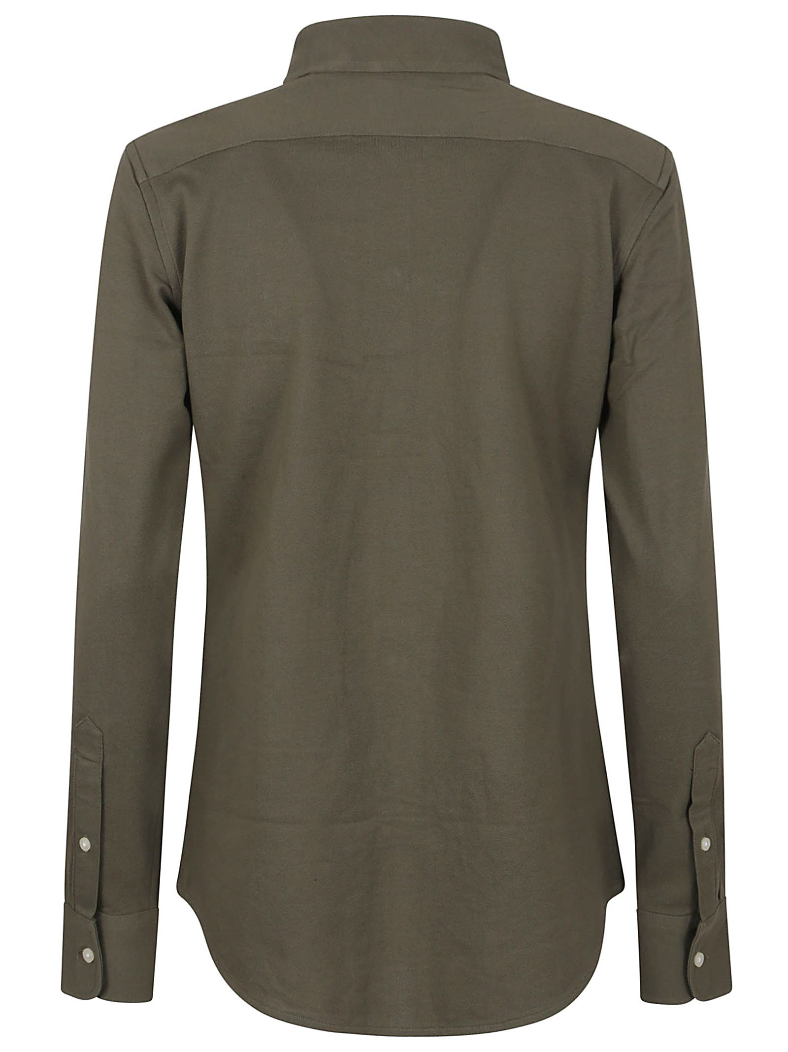 camicia di cotone piqué verde militare con bottoni frontali e colletto button-down, con motivo del Pony Polo e maniche lunghe con polsini abbottonati e orlo curvo