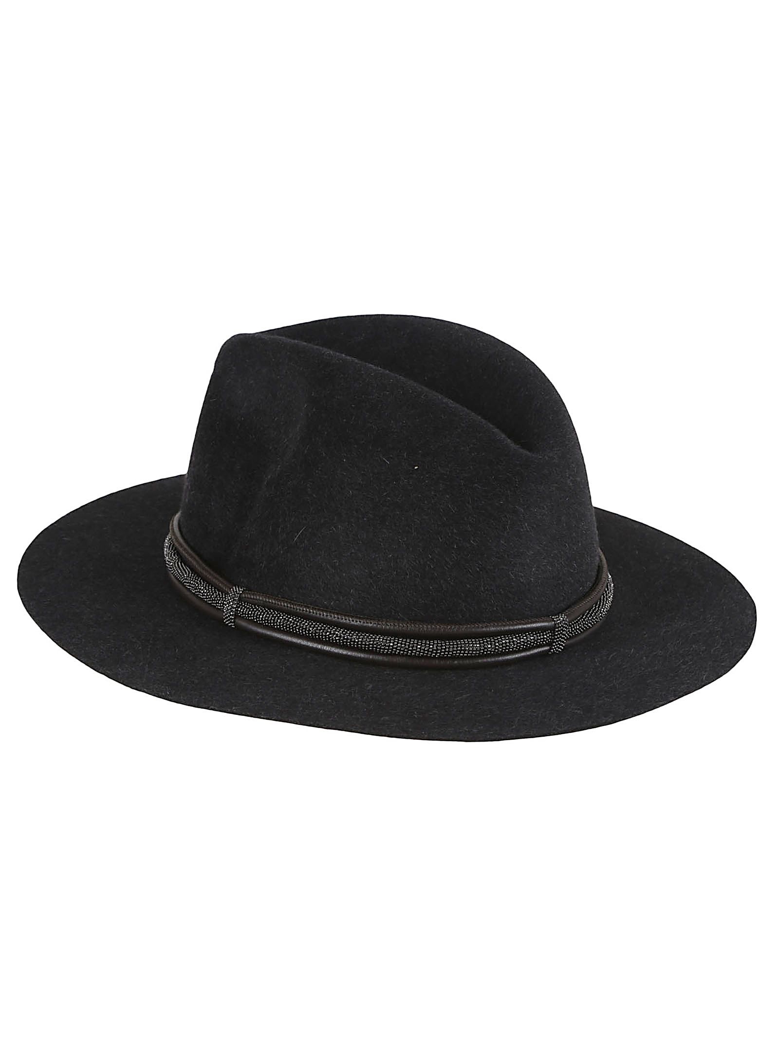 "modello di fedora nero, fascia in pelle tubolare, decorazione in monile, visiera larga"