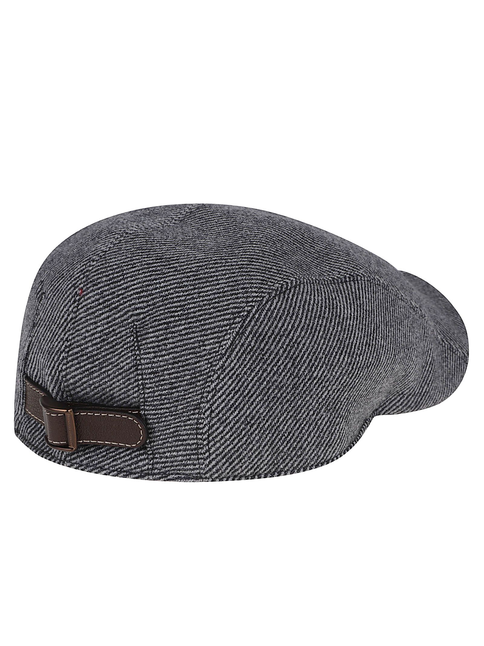 Coppola in flanella di lana vergine con logo ricamato.Caratterizzato dalla nuance a righe grigio scuro e cintino regolabile sul retro