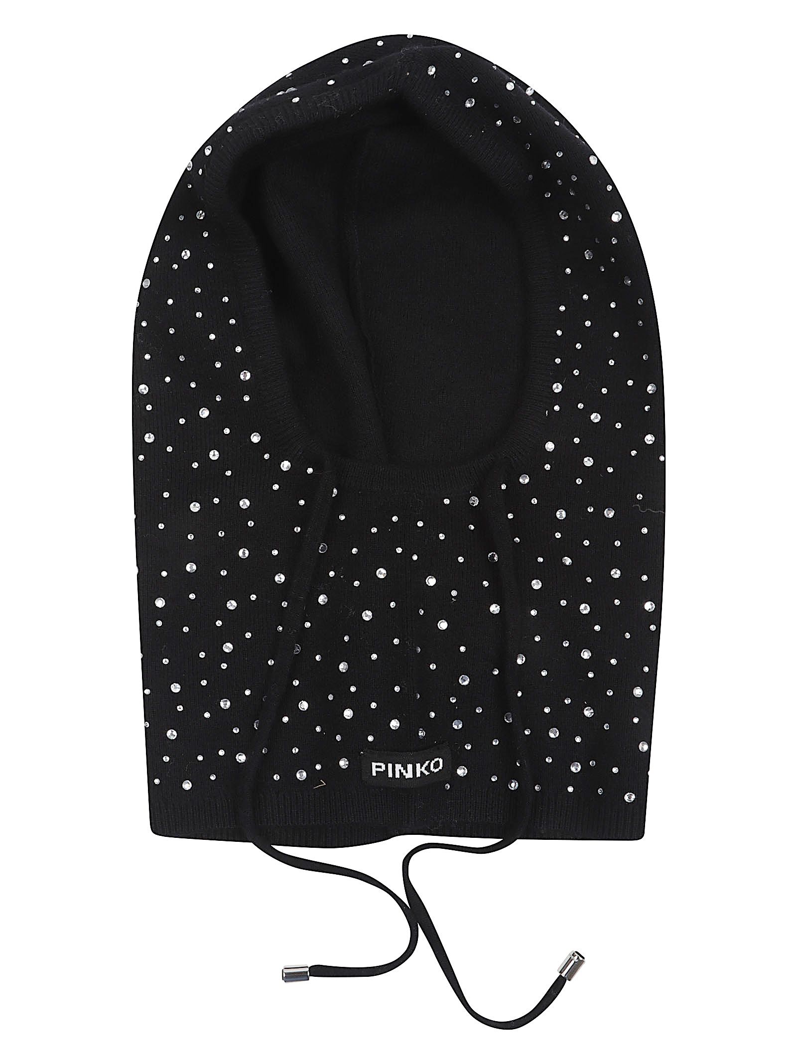 Balaclava in filato cardato di pura lana vergine di PINKO.Regolabile con coulisse; lavorata a coste; impreziosito da innumerevoli strass ed etichetta con logo lettering PINKO tono su tono sul retro.