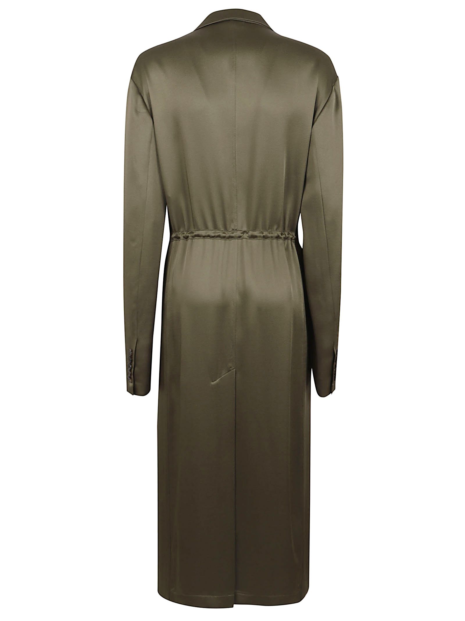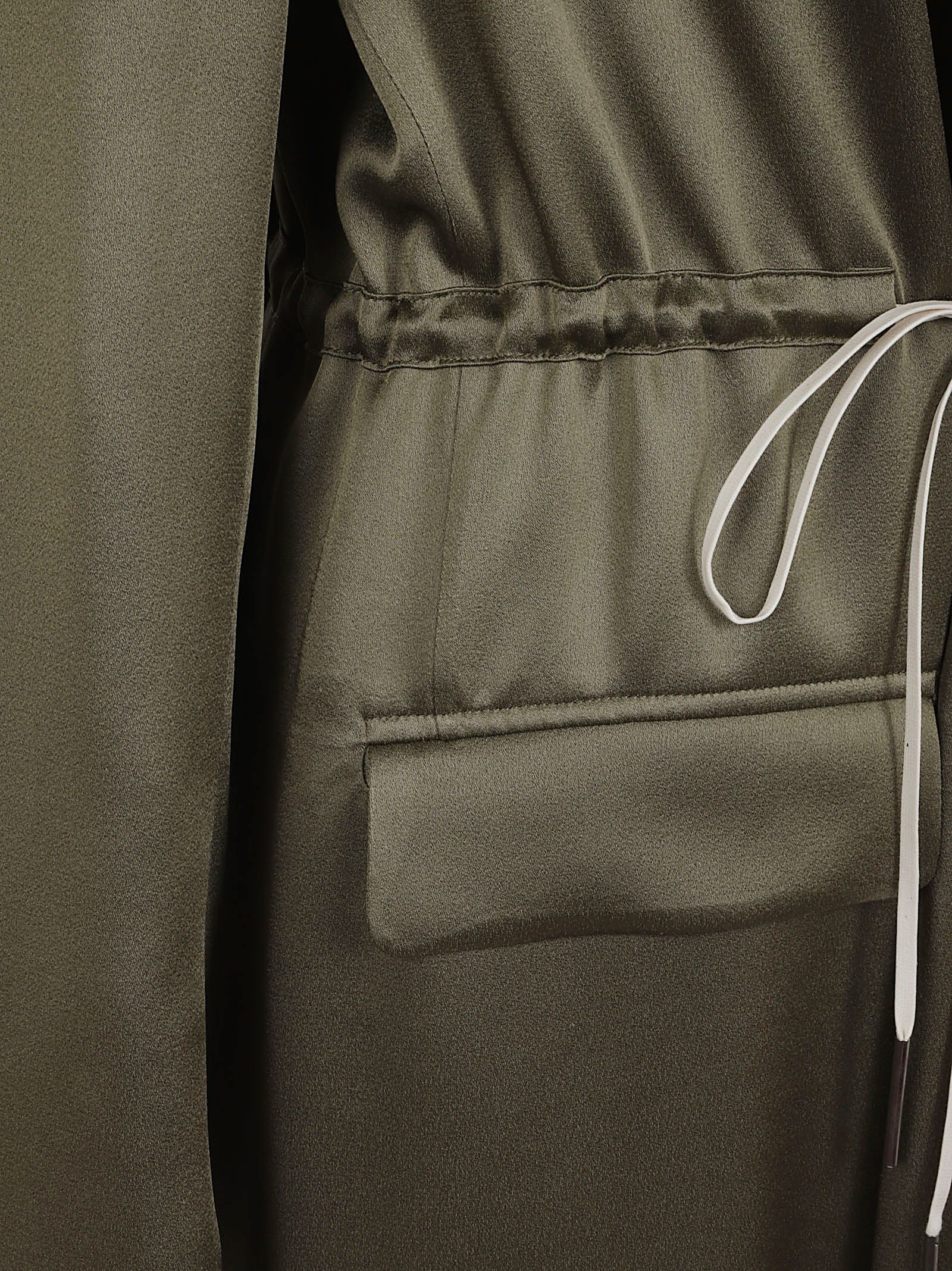 Trench in seta khaki militare con laccetto in vita come chiusura e revere grandi.