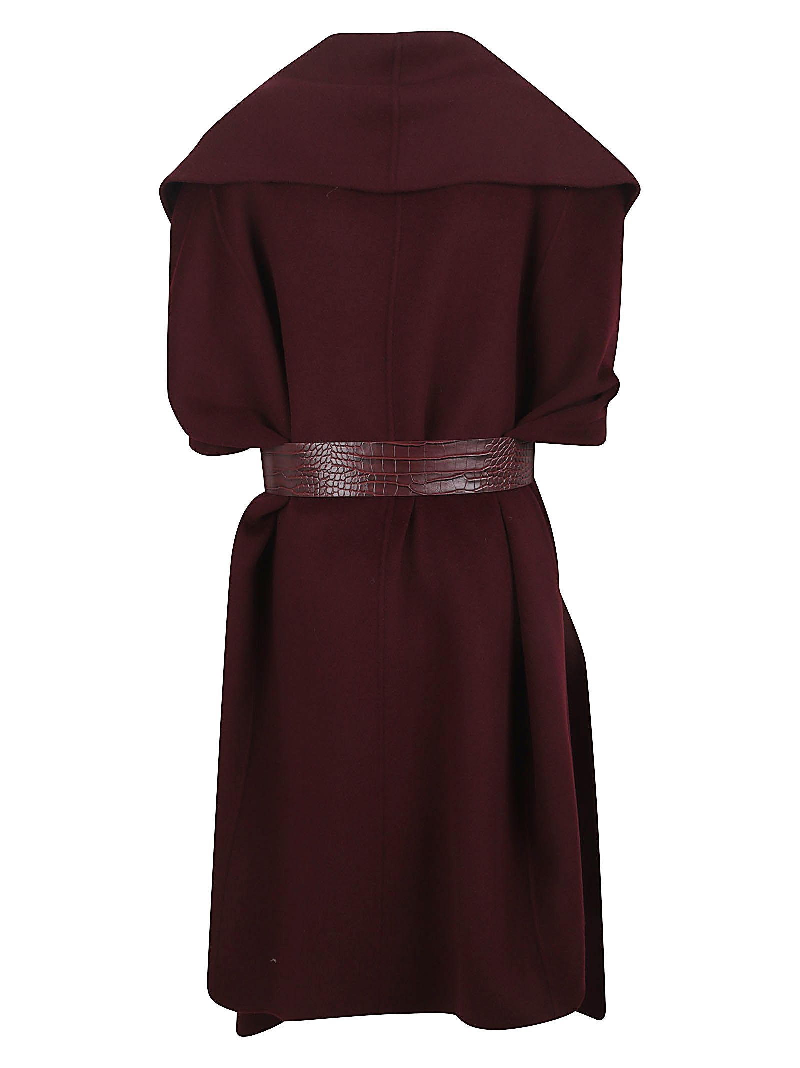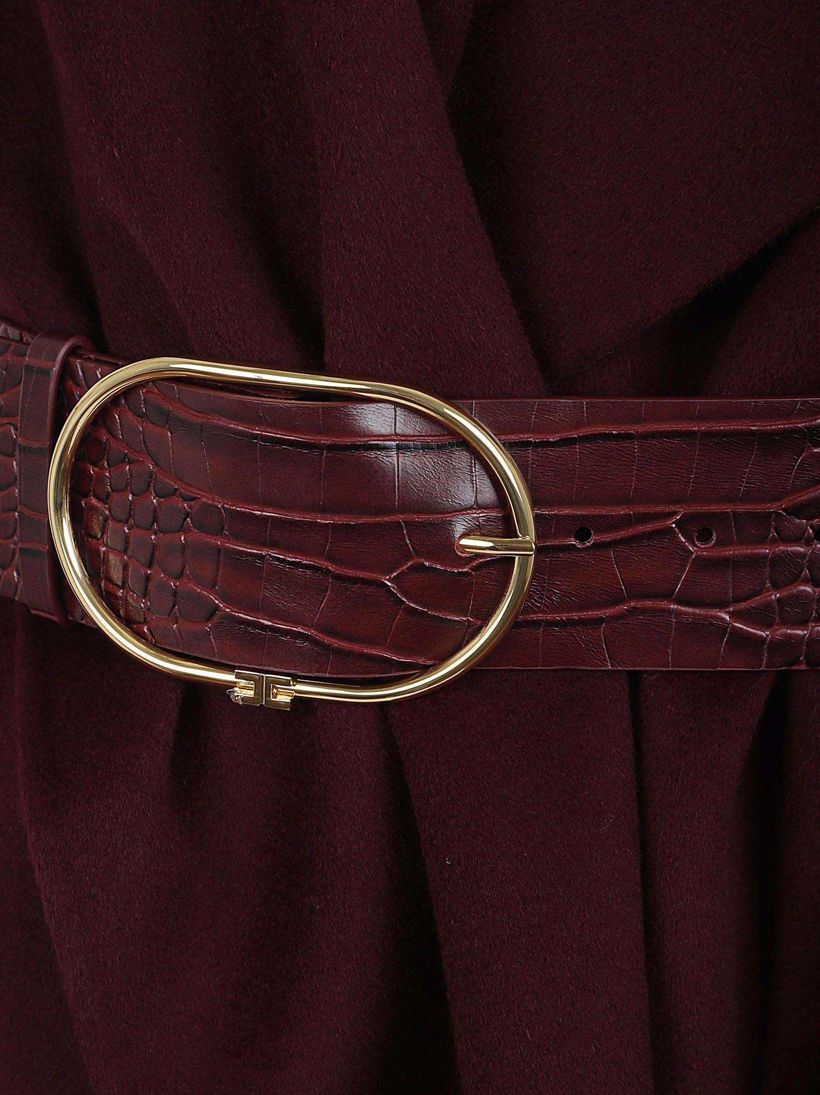 Mantella in panno di lana double sfoderata di ELISABETTA FRANCHI.Caratterizzata da cintura alta e in tono, con texture a stampa cocco che aggiunge carattere e completa di fibbia ad ardiglione con logo in metallo dorato.