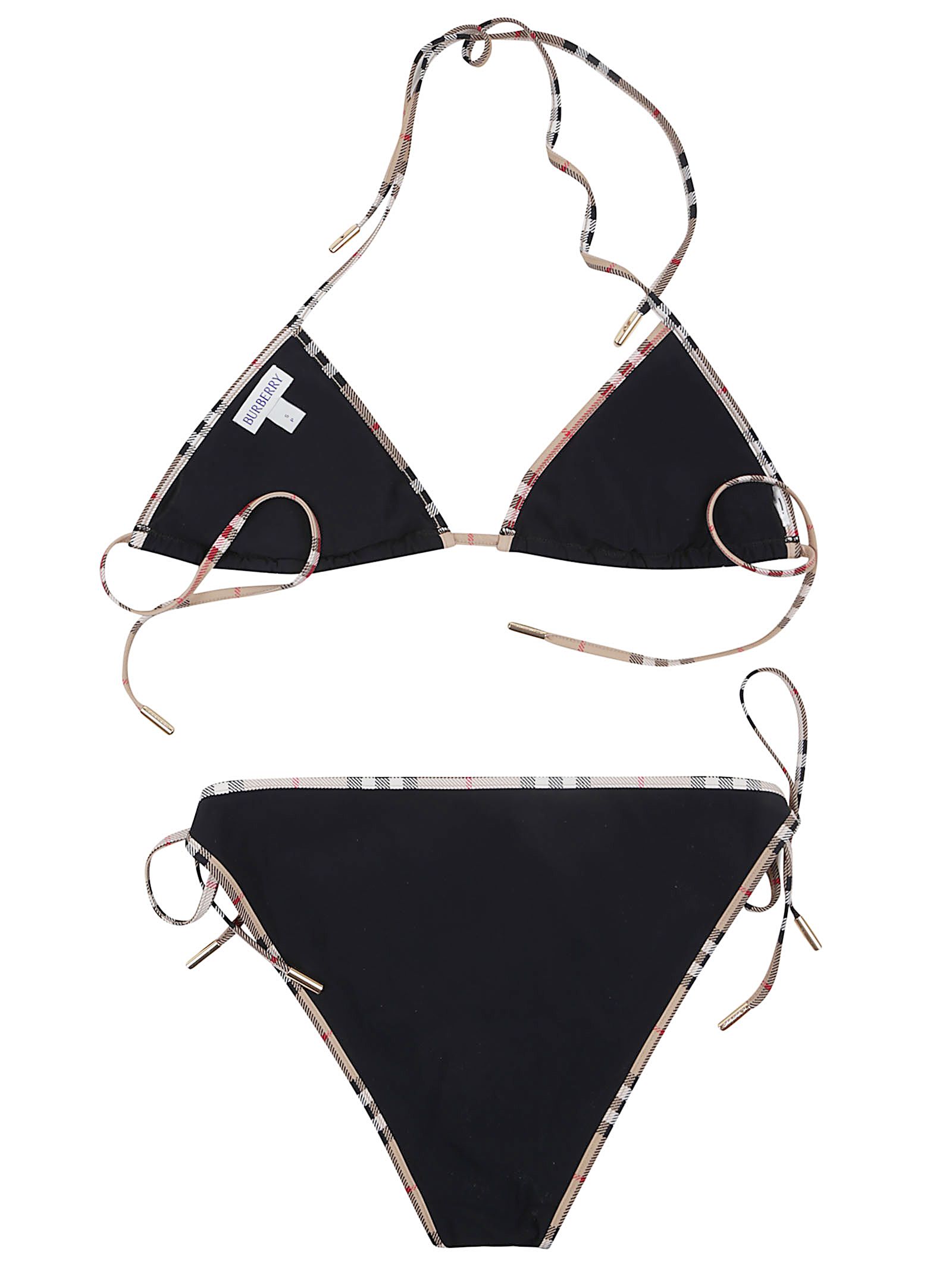 Bikini in nylon stretch di BURBERRY.Parte superiore: allacciato dietro il collo; coppe con imbottitura staccabile. Slip: regolabili con laccetti laterali. Caratterizzato da finiture in Burberry Check.