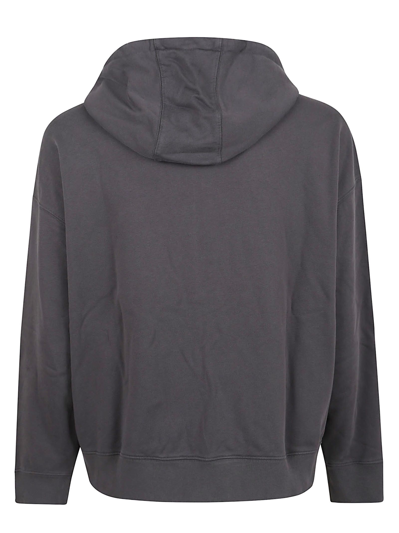 `colore grigio carbone con zip, cappuccio, logo applicato e tasche a filo`