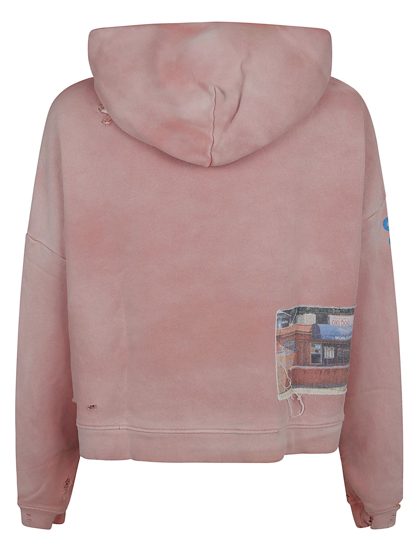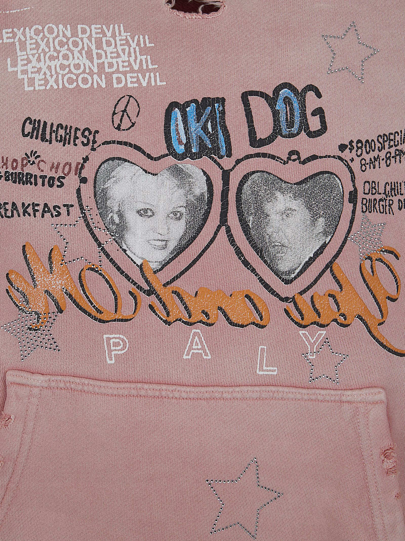 cappuccio con coulisse, stampa grafica con dettagli rosa in stile usurato, maniche lunghe, tasca a marsupio