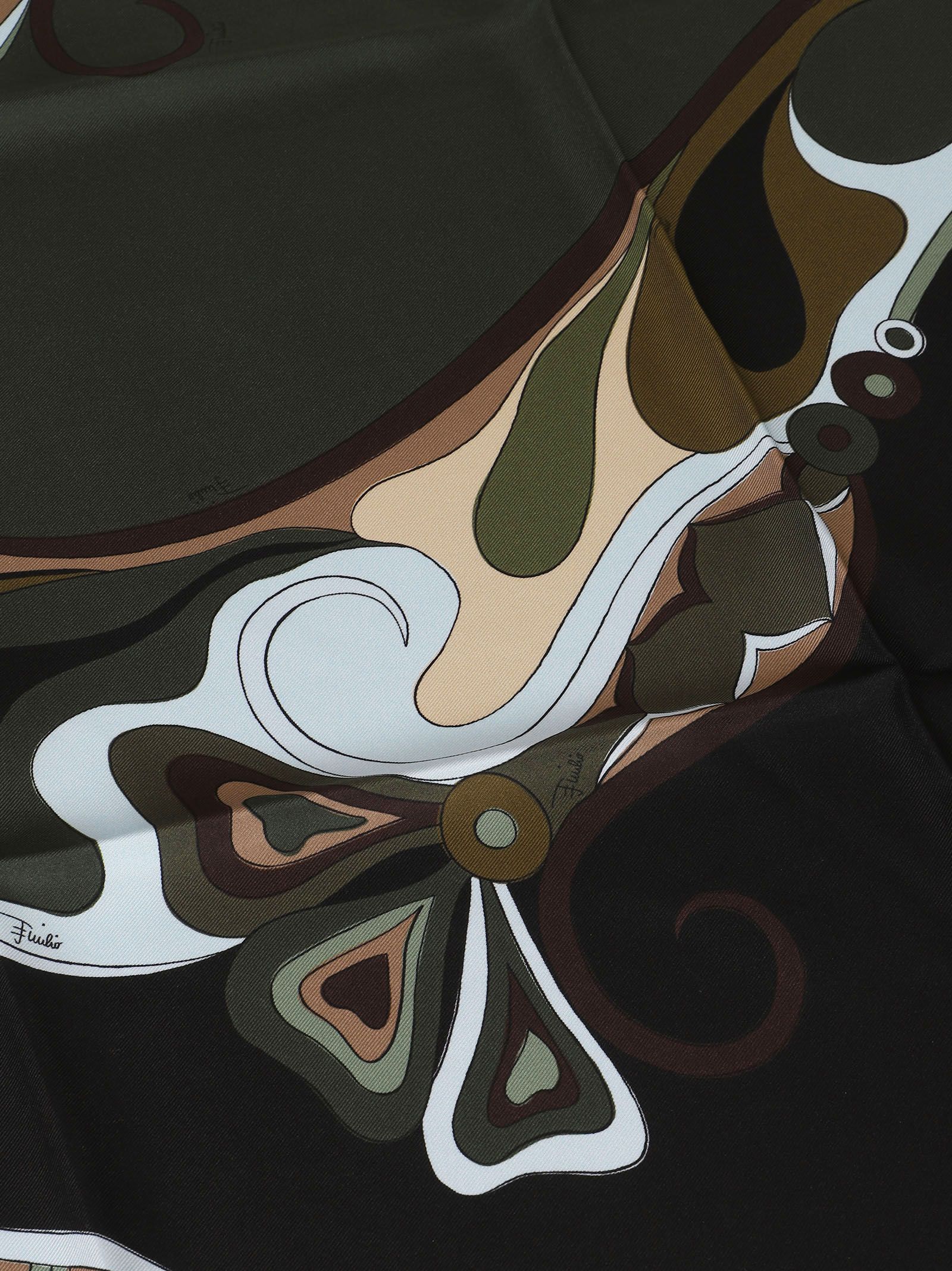 Il foulard iconico carré in twill di seta con stampa Orchidee firmato Pucci. Questo accessorio si distingue per i suoi motivi astratti e fluidi, tipici del marchio, declinati in una sofisticata tonalità denominata Khaki Black