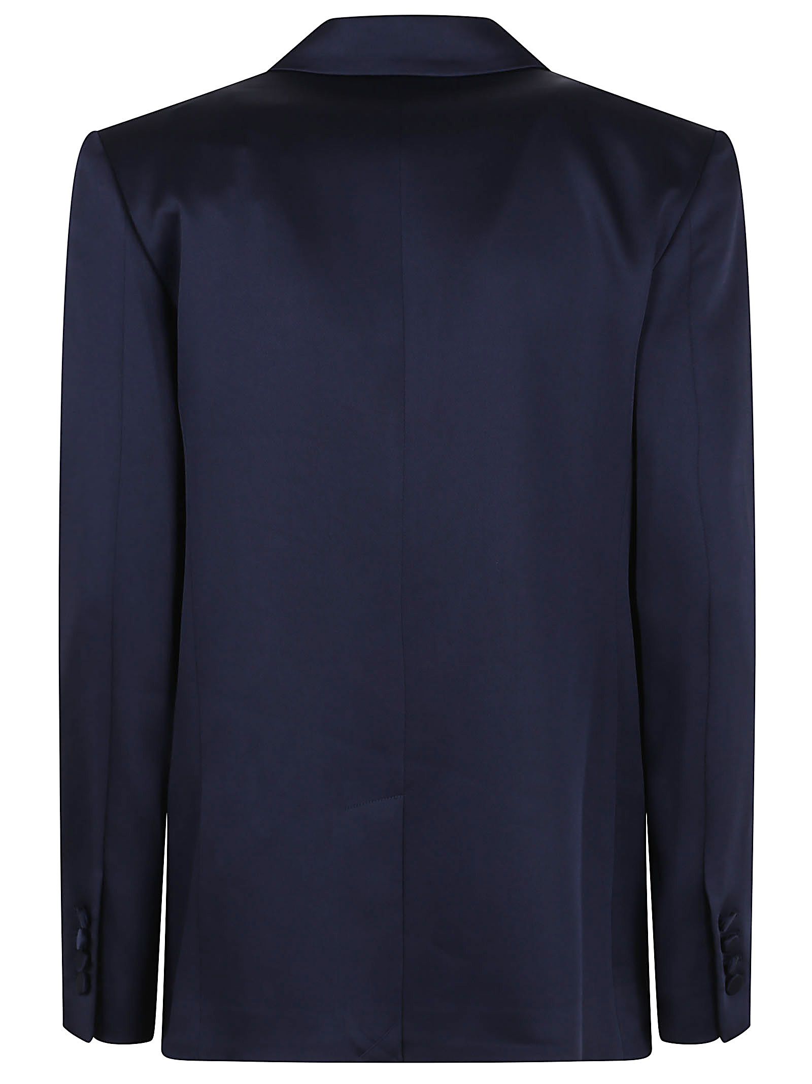 Giacca Norah in raso lucido di JONATHAN SIMKHAI. Design doppiopetto; chiusura con bottoni tono su tono; revers a punta; due tasche con patta e una a filetto.