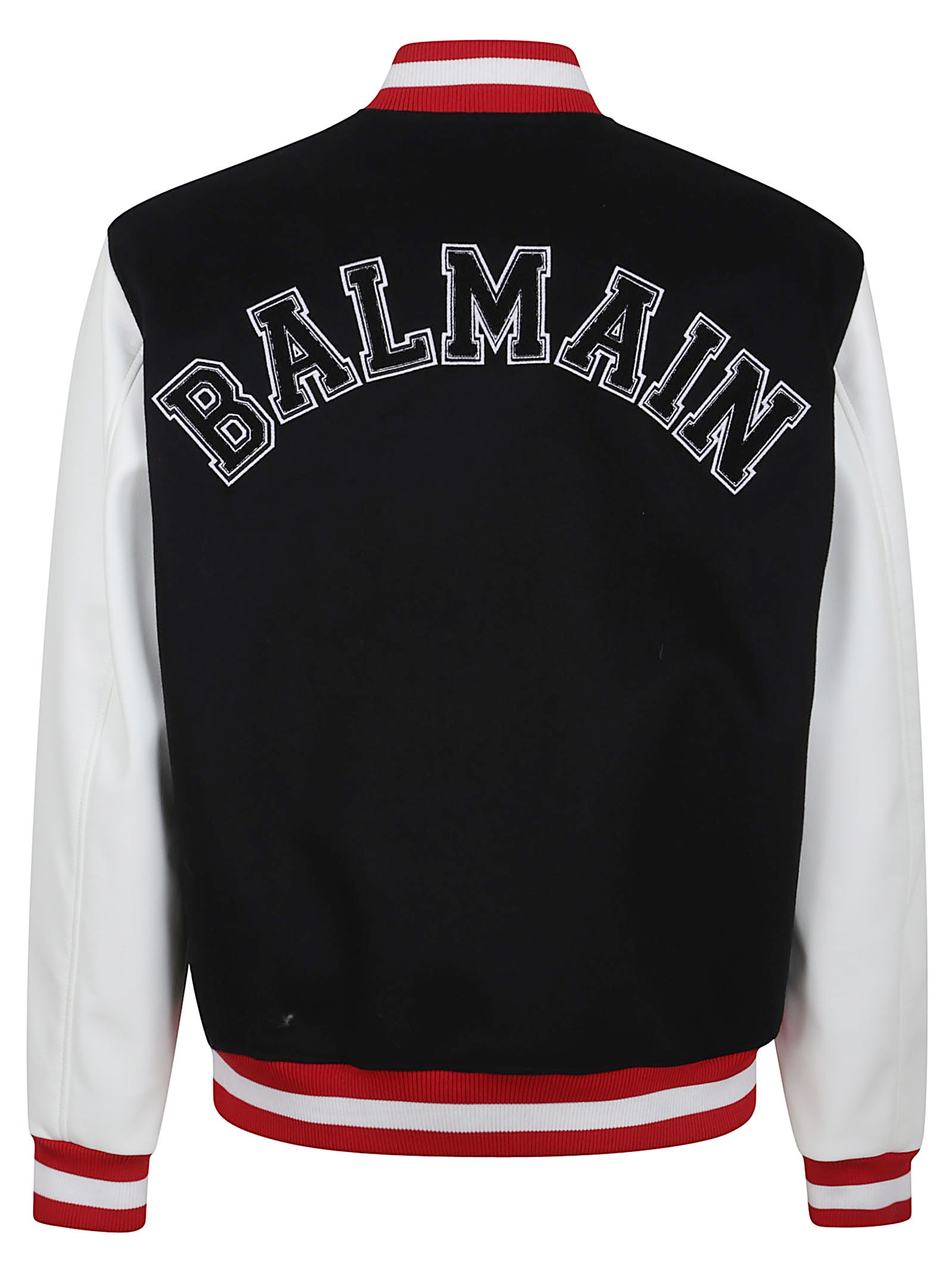 Giacca Varsity in lana ed ecopelle, fodera in raso di BALMAIN.Chiusura sul davanti con sette bottoni a pressione con incisione Balmain; due tasche laterali all’americana e una tasca interna con bottone a pressione; finitura a coste a contrasto con righe; design vestibilità regolare. Caratterizzata da maniche lunghe in ecopelle a contrasto, toppa Varsity in bouclette ricamata sul petto e toppe Balmain in bouclette ricamate sul retro.