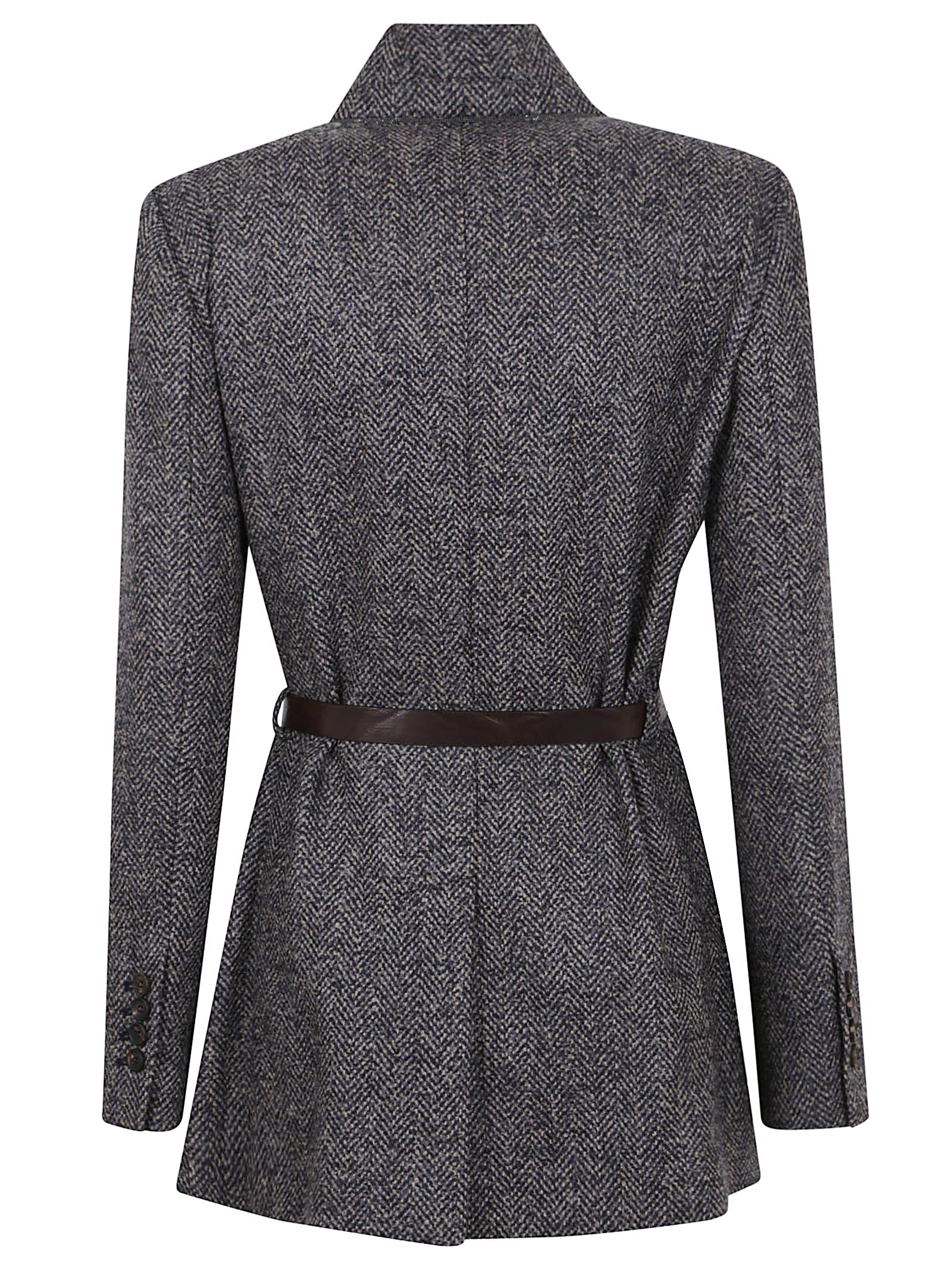 Giacca in tweed chevron di lana vergineIspirazioni dal mondo British, reinterpreta la tradizione sartoriale dalla texture calda e avvolgente.Colletto in piedi, rever sciallato; chiusura con bottone in corno; sfoderata; taschino su petto e tasche basse applicate; polsini con quattro bottoni in corno; spacco singolo su retro.Impreziosita da cintura removibile in pelle che raccoglie i volumi segnando il punto vita e sottile fila di brillante monile.