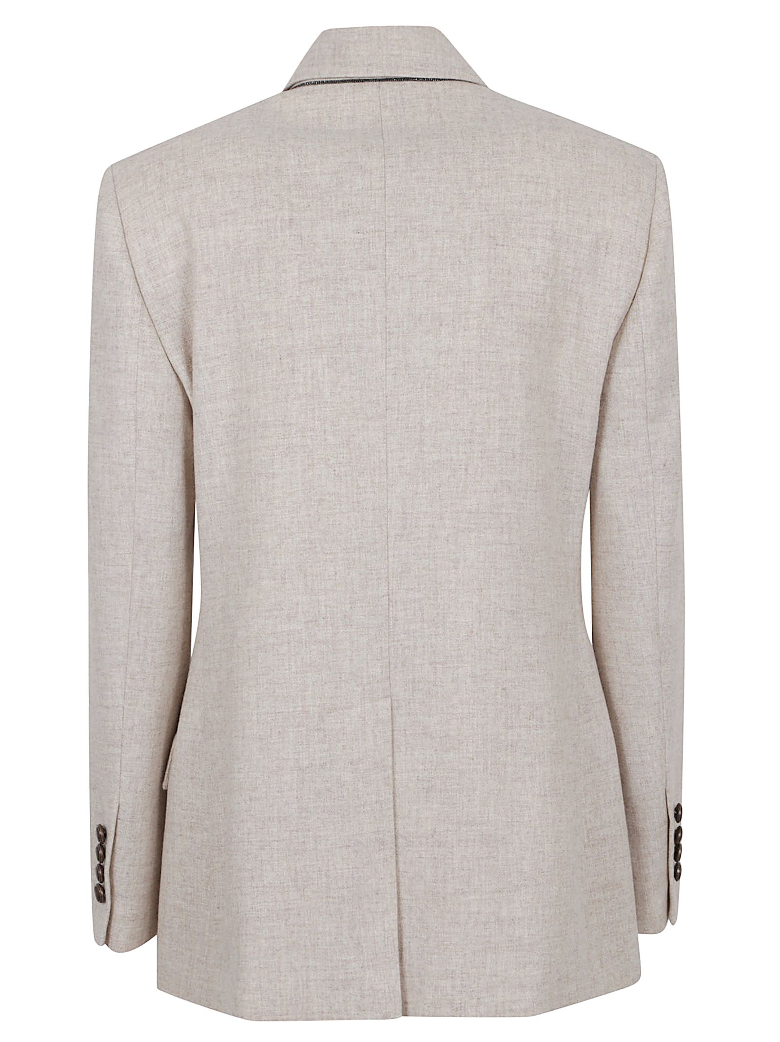Giacca in flanella twill di lana vergine e cashmere di BRUNELLO CUCINELLI.Rever a lancia; chiusura doppiopetto con bottoni in metallo; tasche basse con pattina e taschino su petto; fodera in crêpe misto seta; polsini con quattro bottoni in metallo; spacco singolo su retro.Impreziosita da ricamo in brillante monile, decorazione iconica delle collezioni Brunello Cucinelli.