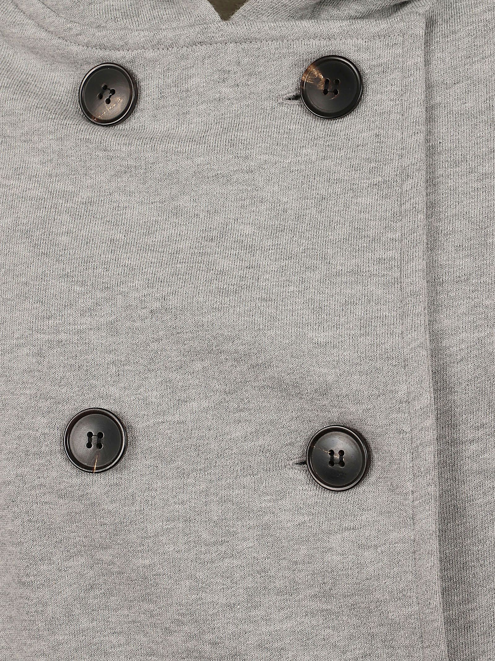 Eleva il tuo guardaroba quotidiano con la giacca Havipa, un perfetto connubio tra il comfort di una felpa e la struttura sofisticata di un cappotto sartoriale.Caratterizzata da un taglio corto con silhouette a trapezio che garantisce libertà di movimento e uno stile d`avanguardia.Chiusura doppiopetto con sei ampi bottoni a contrasto che aggiungono un tocco di carattere e rigore geometrico al capo.Dotata di un ampio cappuccio integrato per una protezione extra e maniche a raglan a tre quarti, ideali per mettere in mostra polsini o maglioni sottostanti.Indossala sopra un abito midi per un look urban-chic, oppure abbinala a un paio di jeans a gamba larga e sneakers per un outfit casual ma estremamente curato.