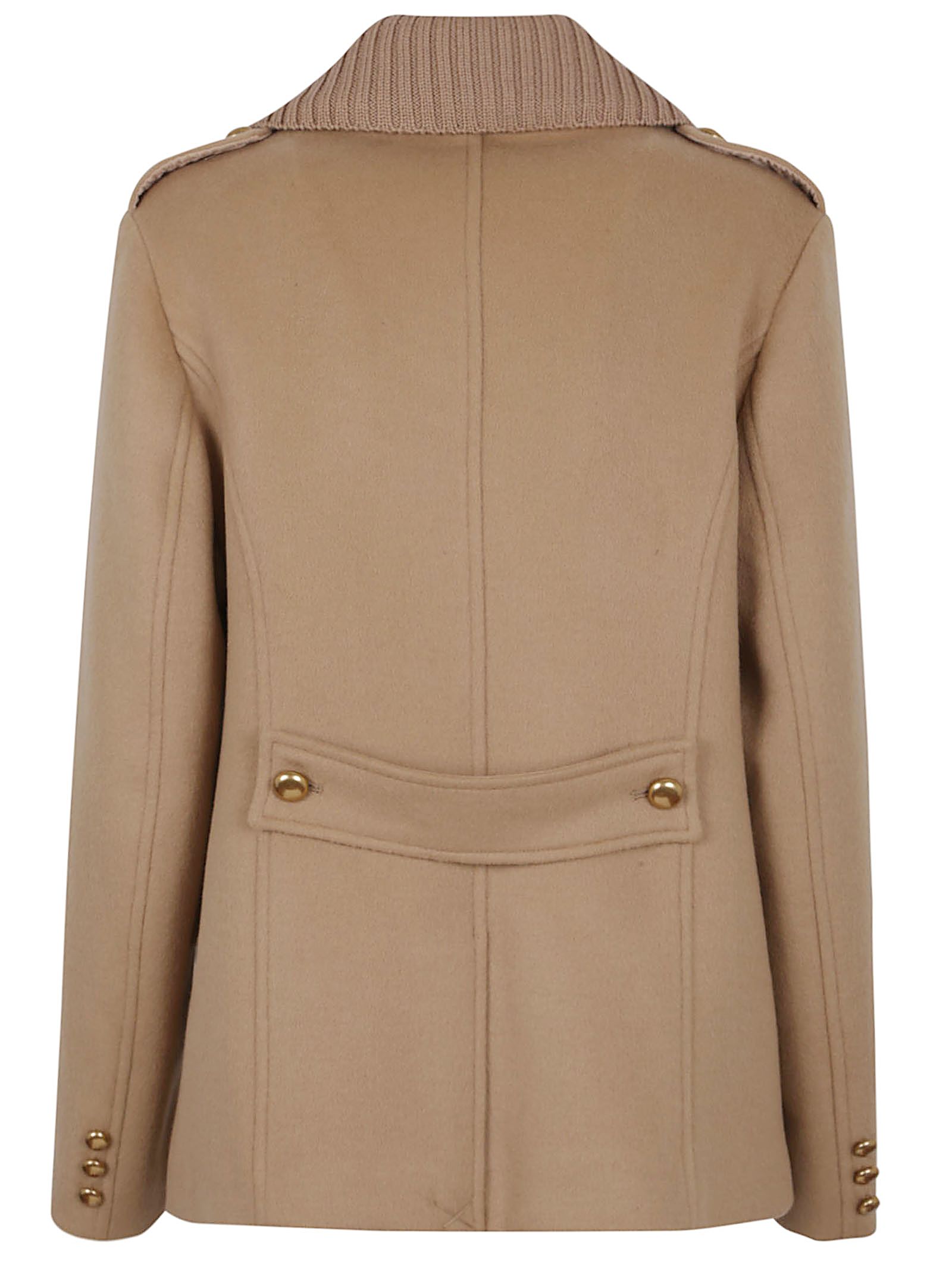 Giacca in pura lana di PAROSH.Maniche lunghe; chiusura frontale con bottoni oro; due tasche oblique e due frontali applicate con patta.Caratterizzata da collo in maglia di lana a coste.