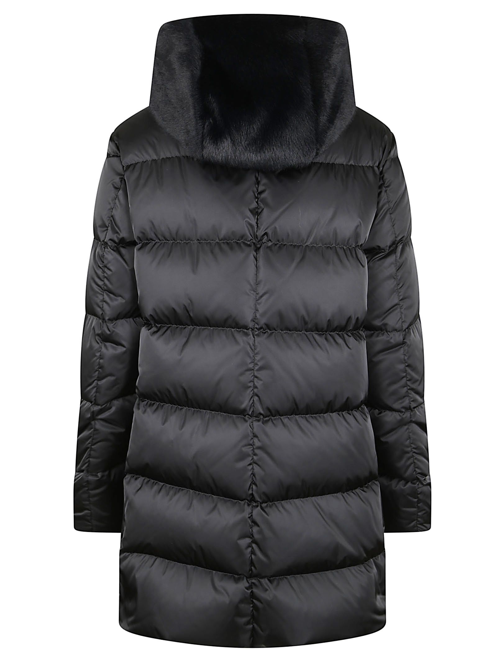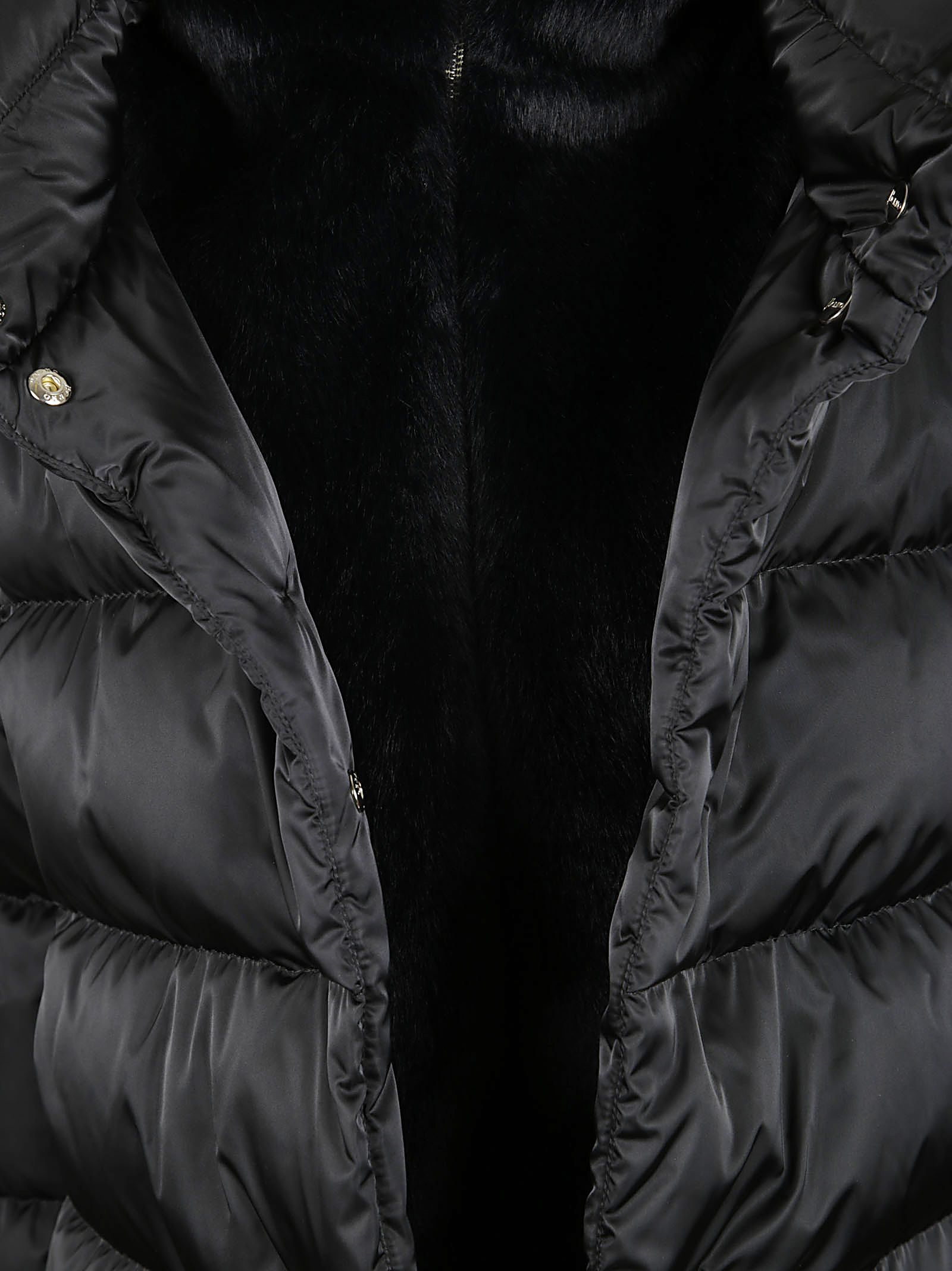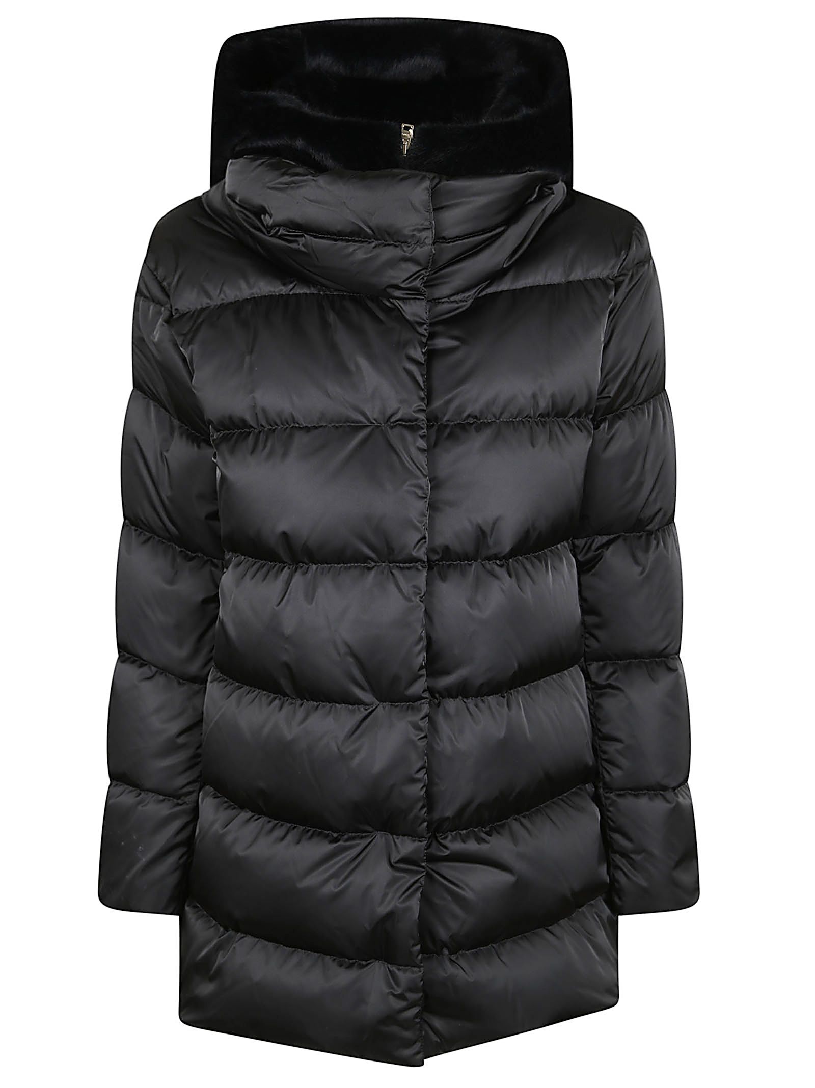 A-Shape in raso BY HERNO.Maniche lunghe; cappuccio fisso; tasche a filetto; doppia chiusura con zip nascosta da bottoni.Imbottitura in piuma d`oca.Dettaglio cappuccio in pelliccia cruelty-free tono su tono.