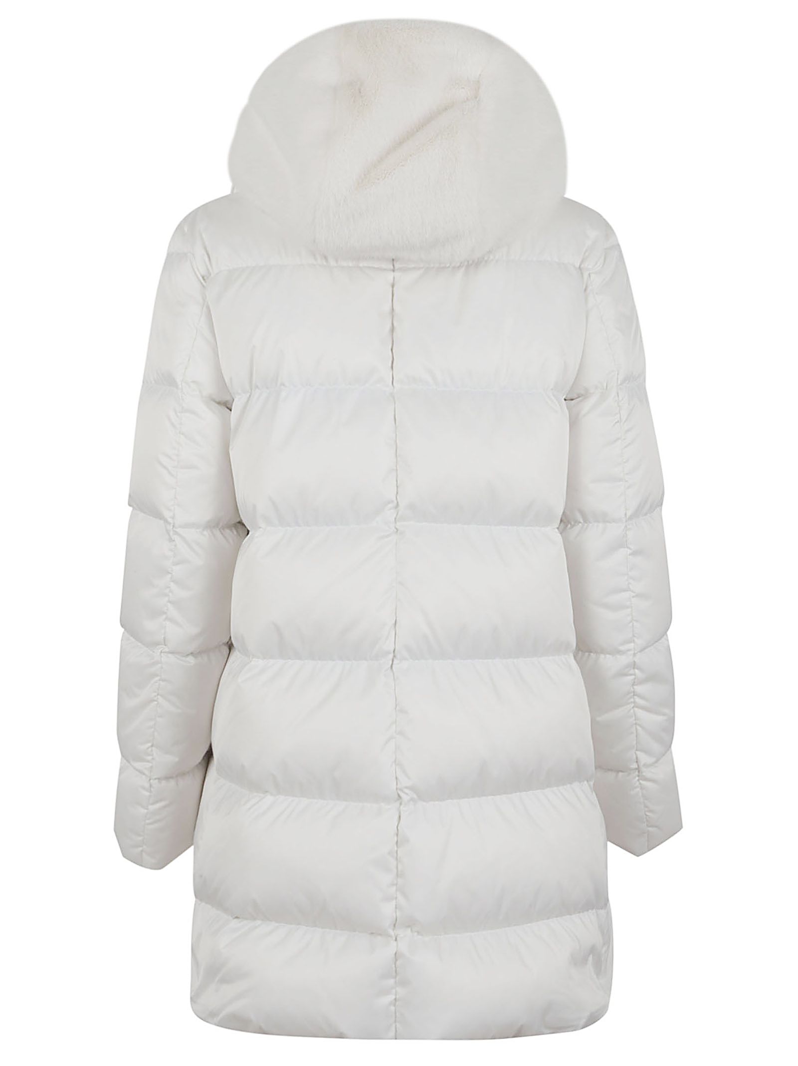 A-Shape in raso BY HERNO.Maniche lunghe; cappuccio fisso; tasche a filetto; doppia chiusura con zip nascosta da bottoni.Imbottitura in piuma d`oca.Dettaglio cappuccio in pelliccia cruelty-free tono su tono.