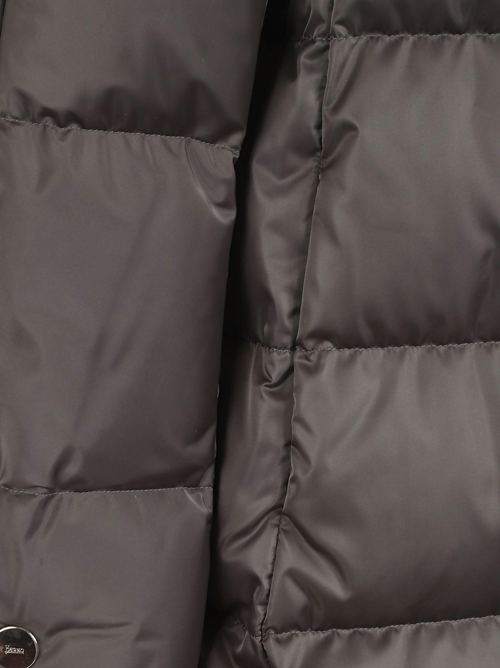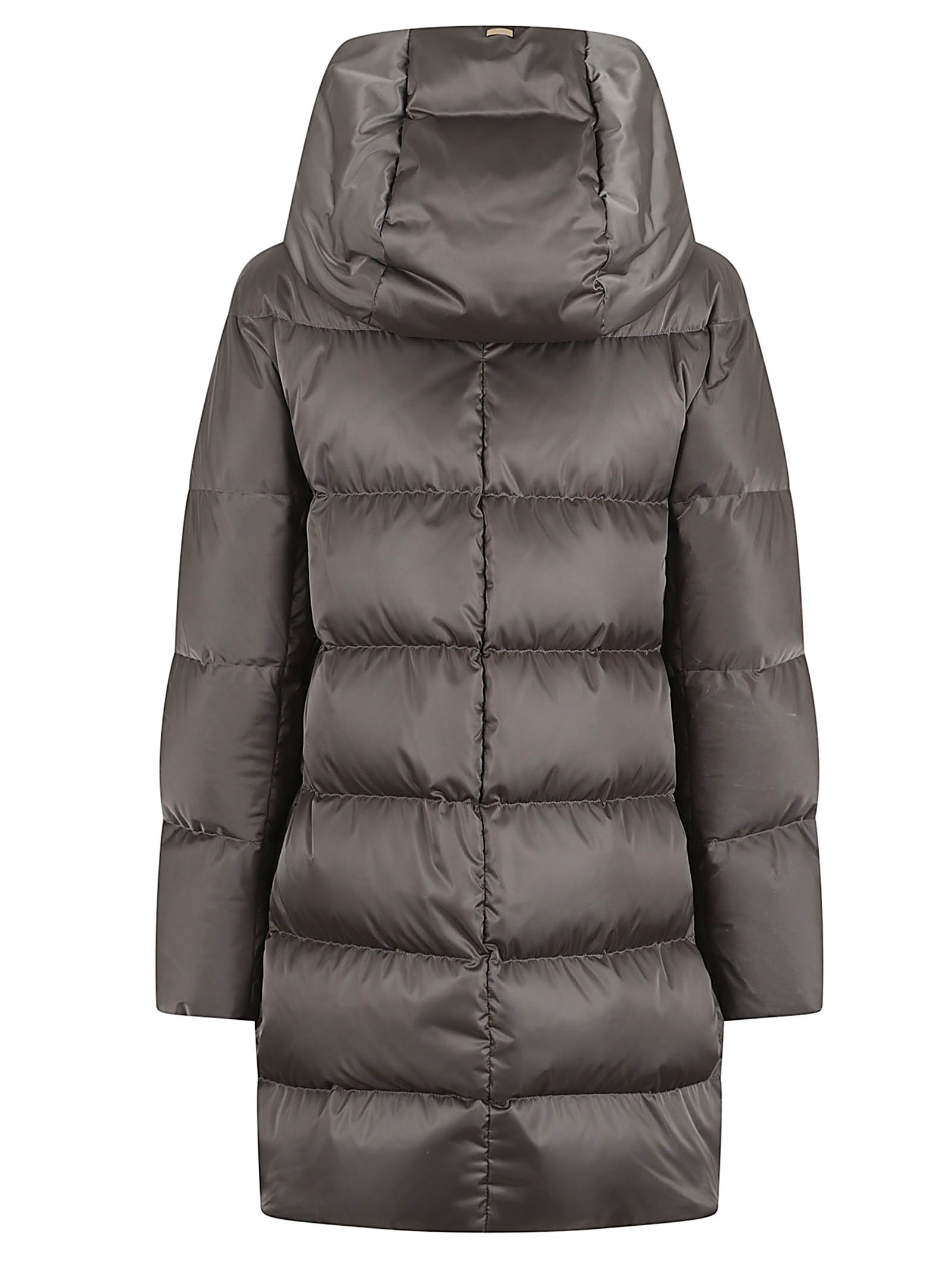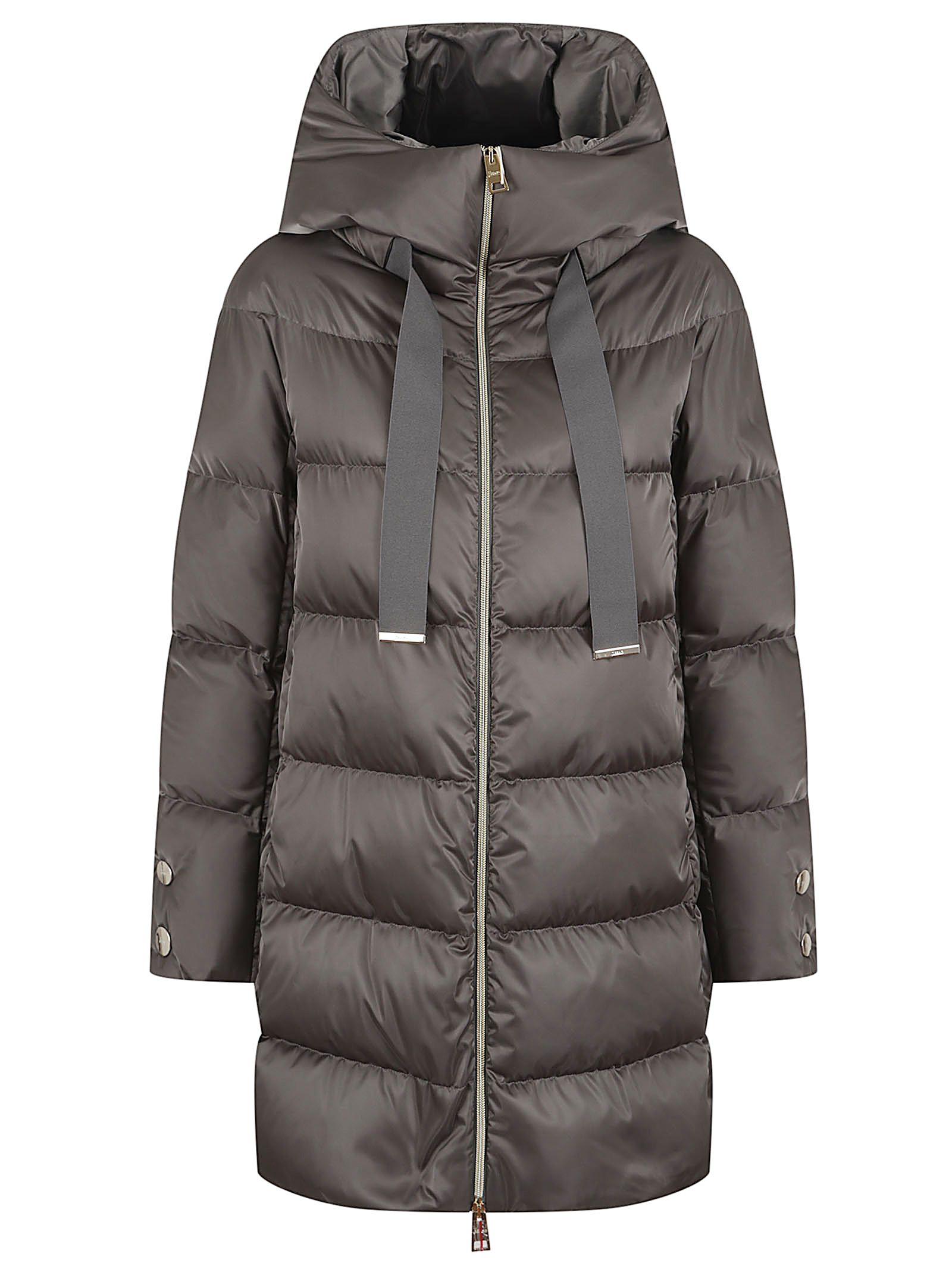 A-Shape in raso BY HERNO.Collo alto con cappuccio; chiusura frontale cn zip doppio cursore; maniche lunghe con bottoni automatici con logo. Imbottitura in piuma d`oca.Dettaglio maxi coulisse.
