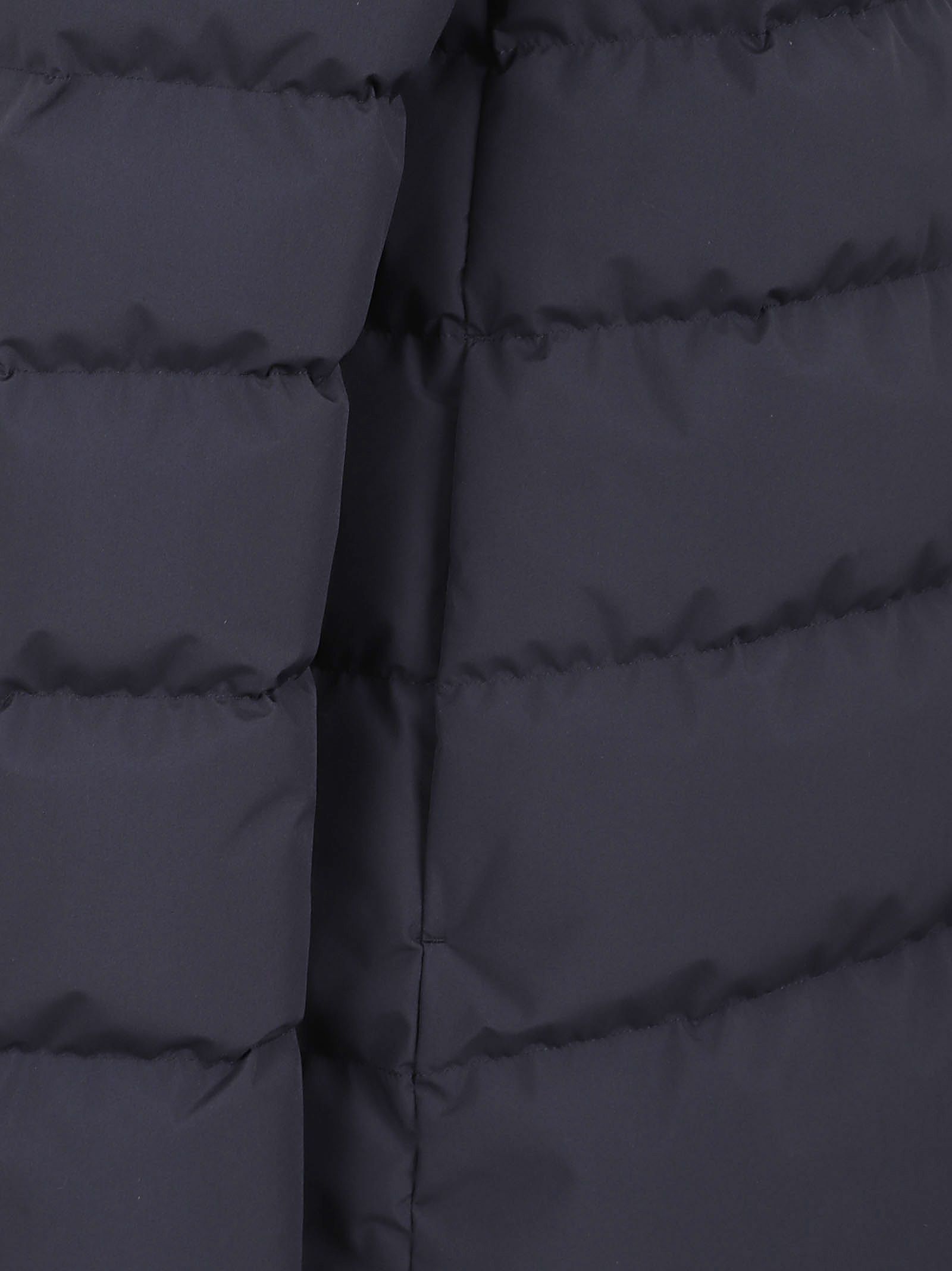 design imbottito blu con cappuccio, chiusura con zip, maniche lunghe