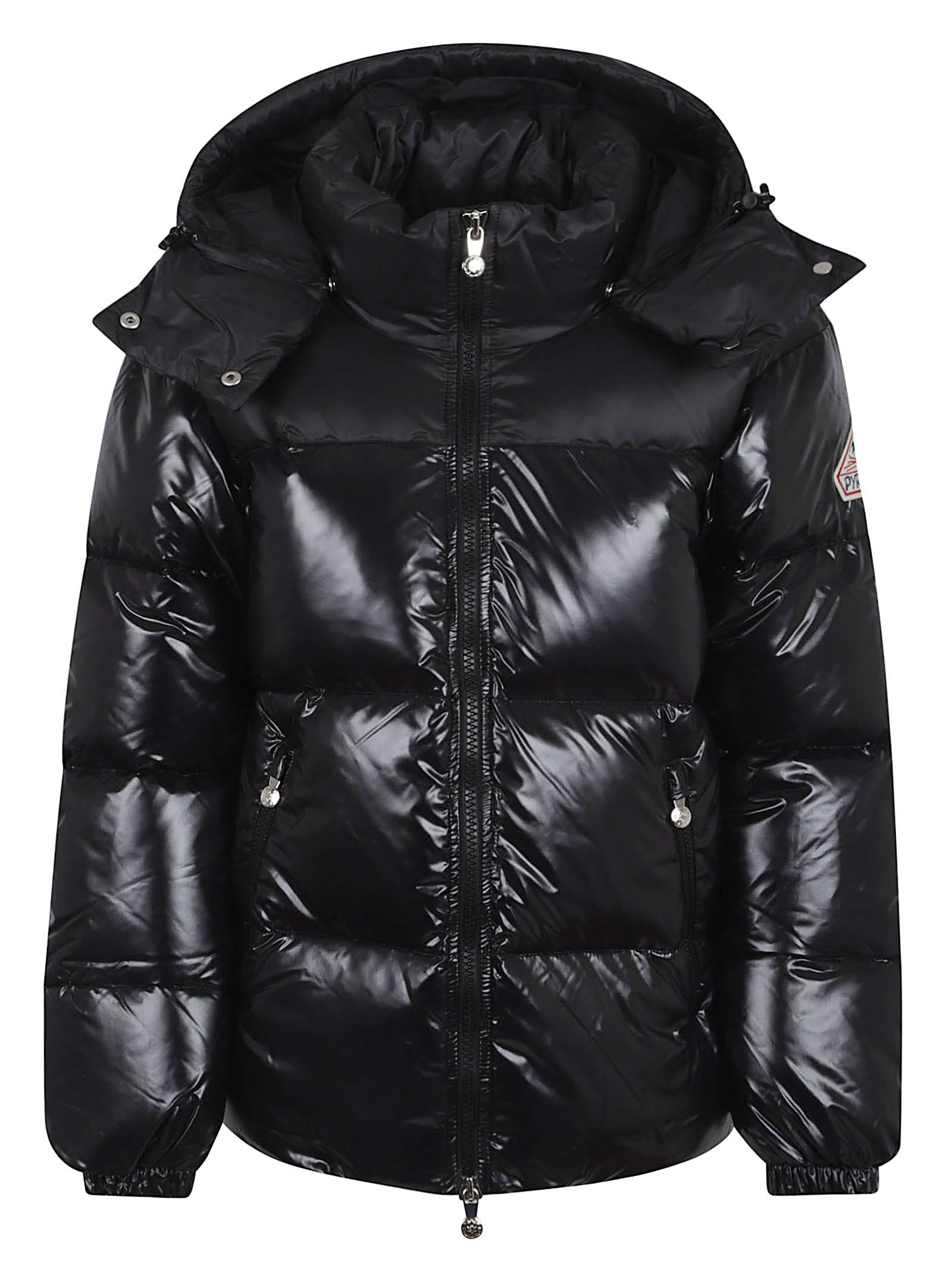 cappuccio imbottito viola con chiusura a zip e patch con logo