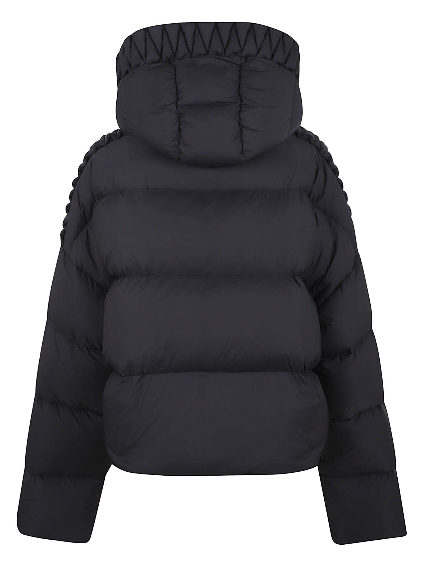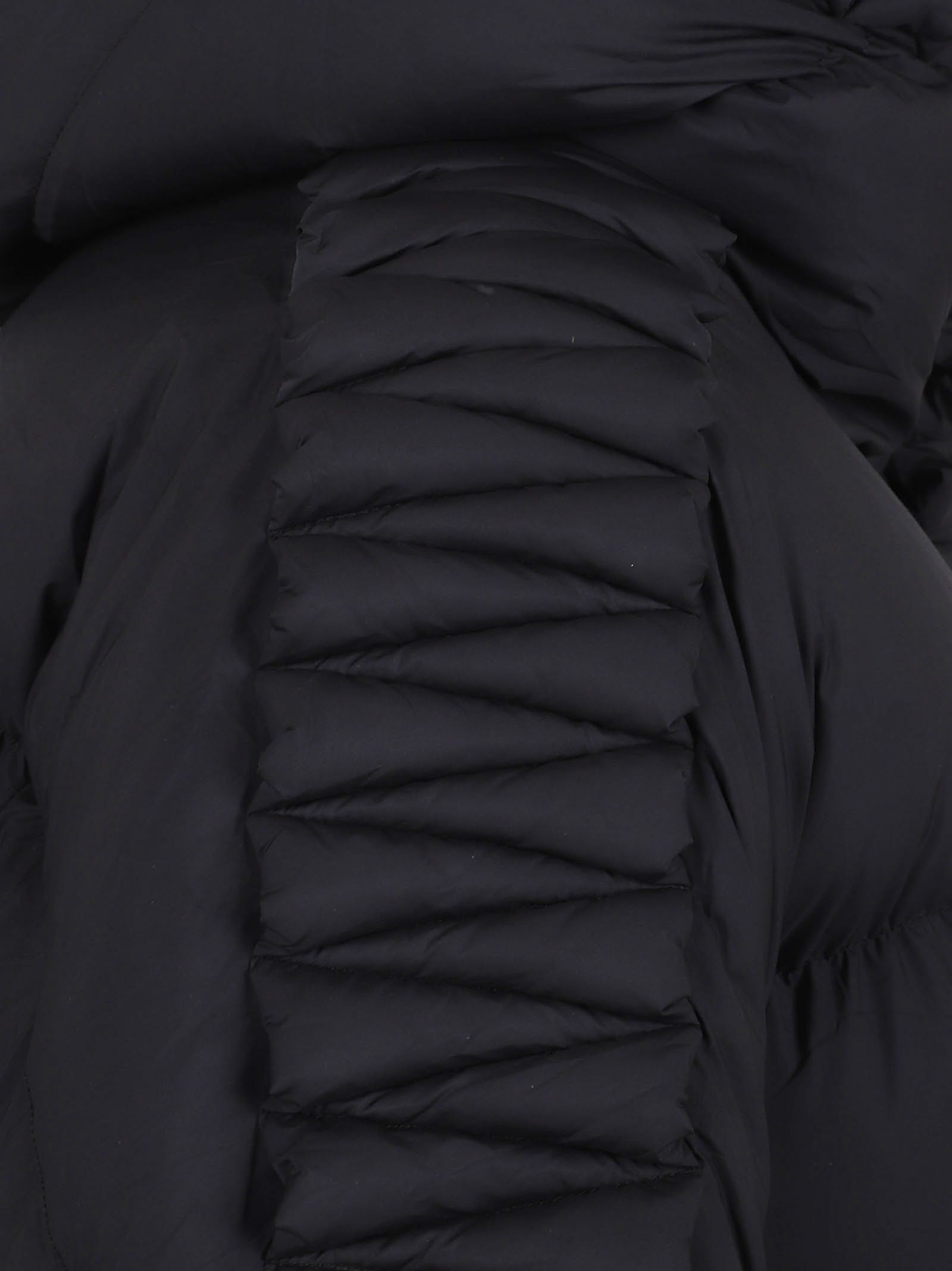design imbottito nero, finitura trapuntata a zigzag, dettaglio con bottoni nascosti, spalle scese, maniche lunghe, cappuccio classico