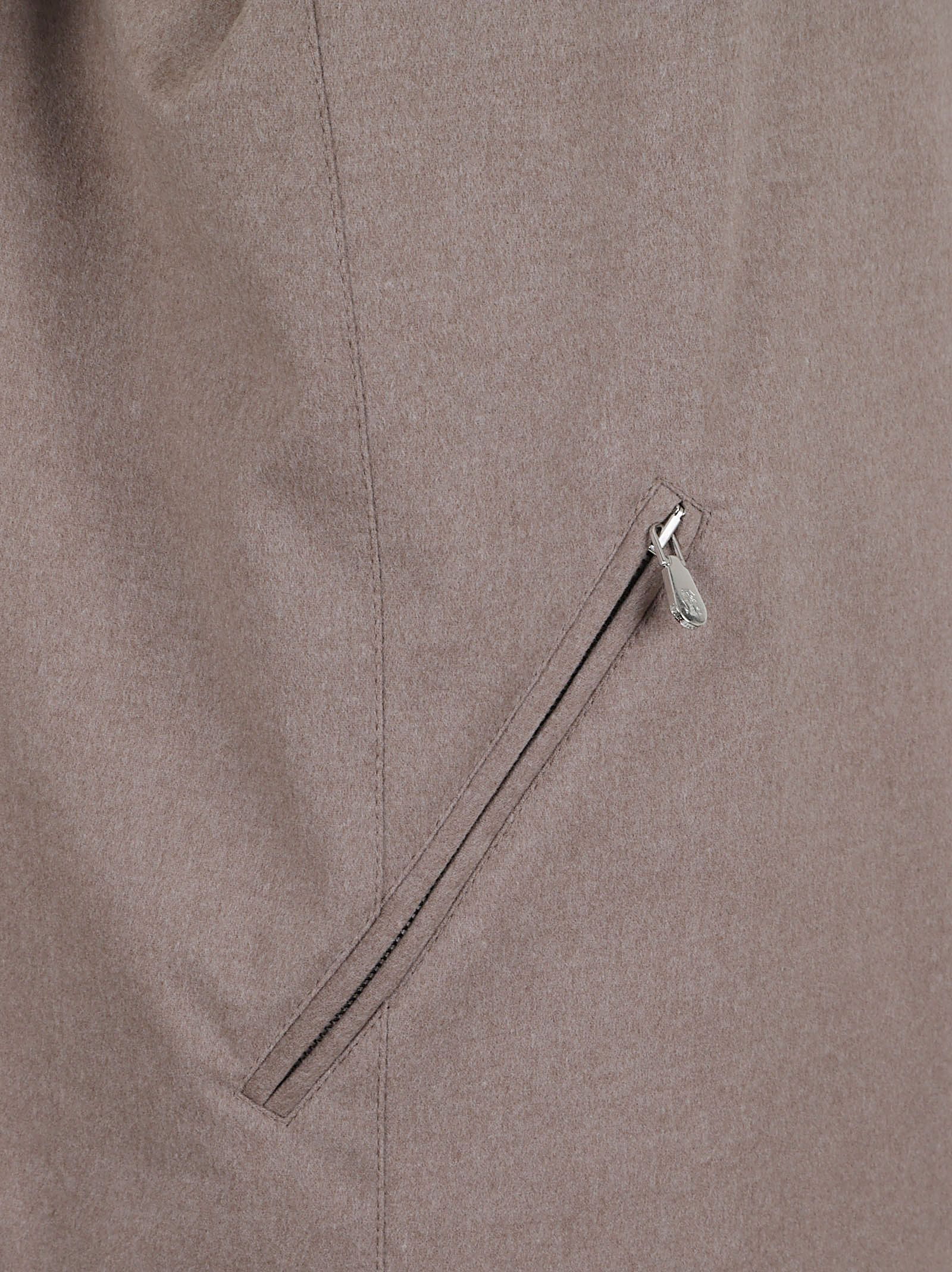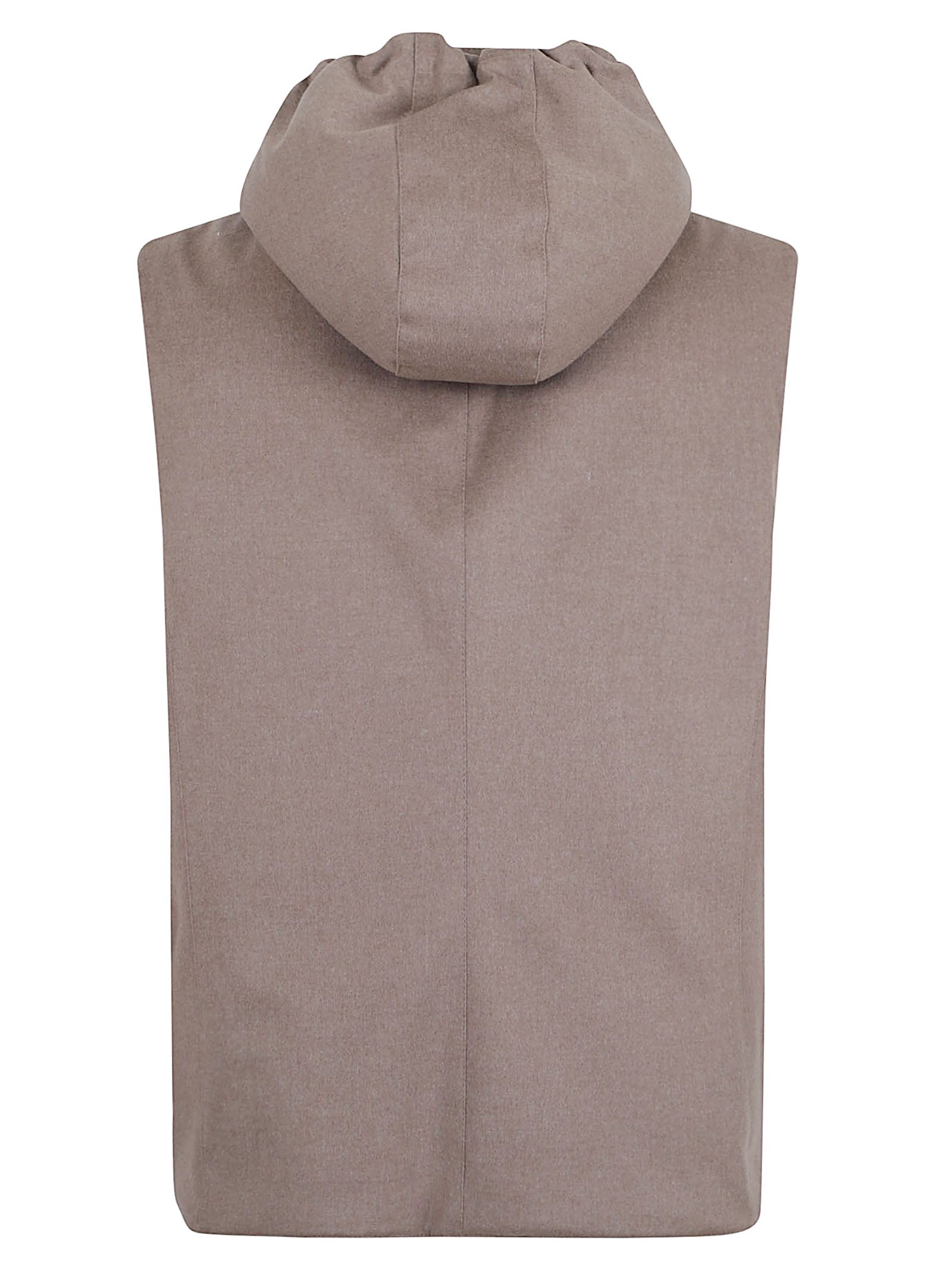 Piumino in flanella di lana membranata di BRUNELLO CUCINELLI.Senza maniche; collo in piedi; chiusura con bottoni automatici; cappuccio removibile, foderato e regolabile con coulisse; taschino su petto, tasche basse con zip e due tasche interne con bottone e un portapenna.Imbottitura in piumino d`oca di alta qualità.