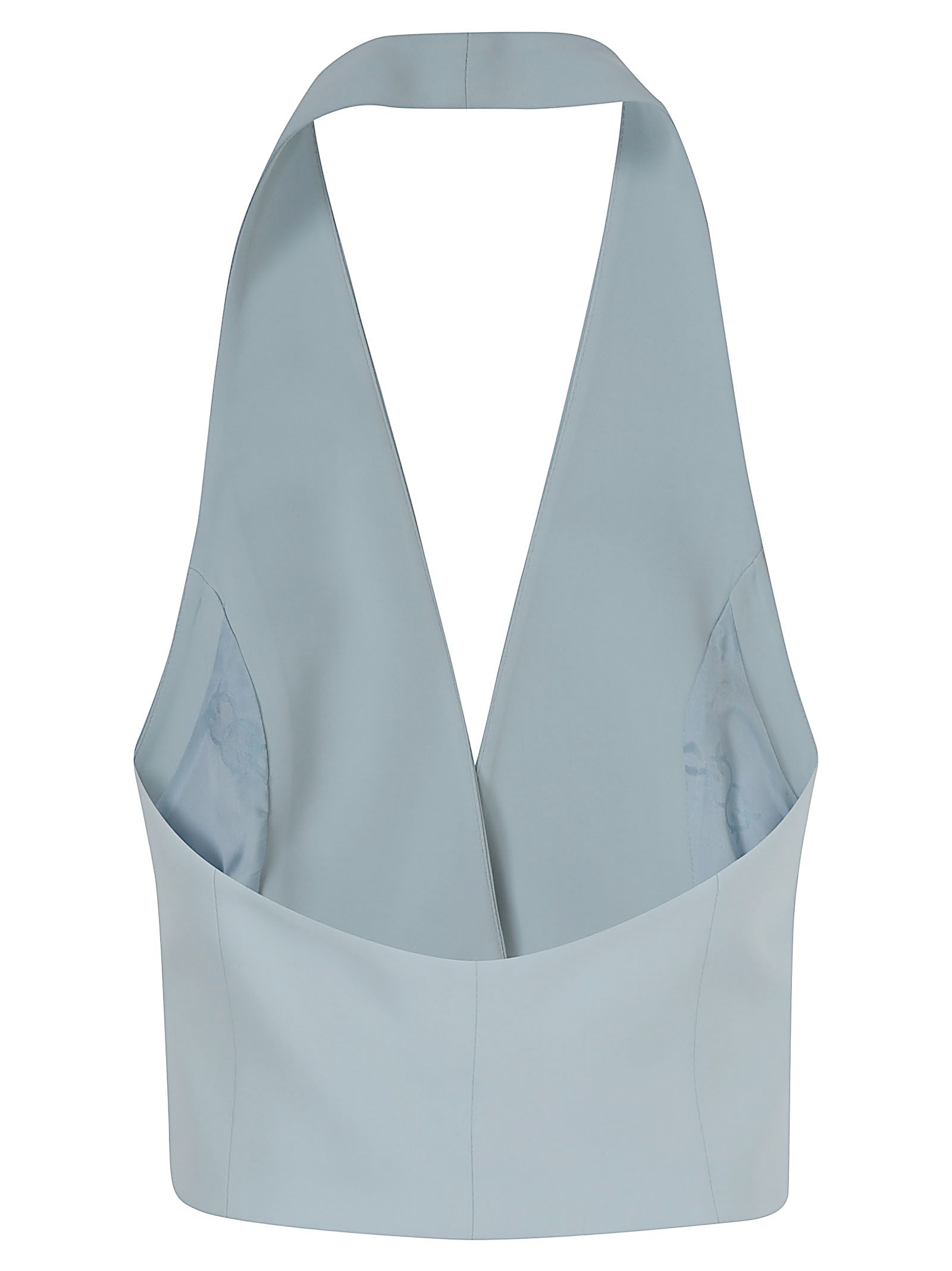 Gilet in tessuto cady tecnico di PINKO.Scollo all`americana con allacciatura dietro il collo e schiena scoperta; chiusura con tre bottoni in metallo davanti; due tasche a filetto. Design vestibilità crop e slim che segue le forme del corpo.