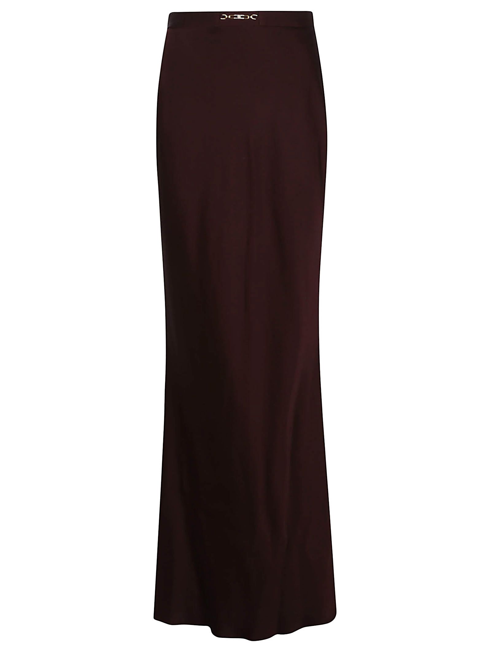 Gonna in satin crêpe di ELISABETTA FRANCHI.Chiusura con zip nascosta; design vestibilità slim, linea a sirena per un fit fluido e armonioso.Impreziosita da dettaglio gioiello in metallo dorato con logo in strass posizionato sulla vita.
