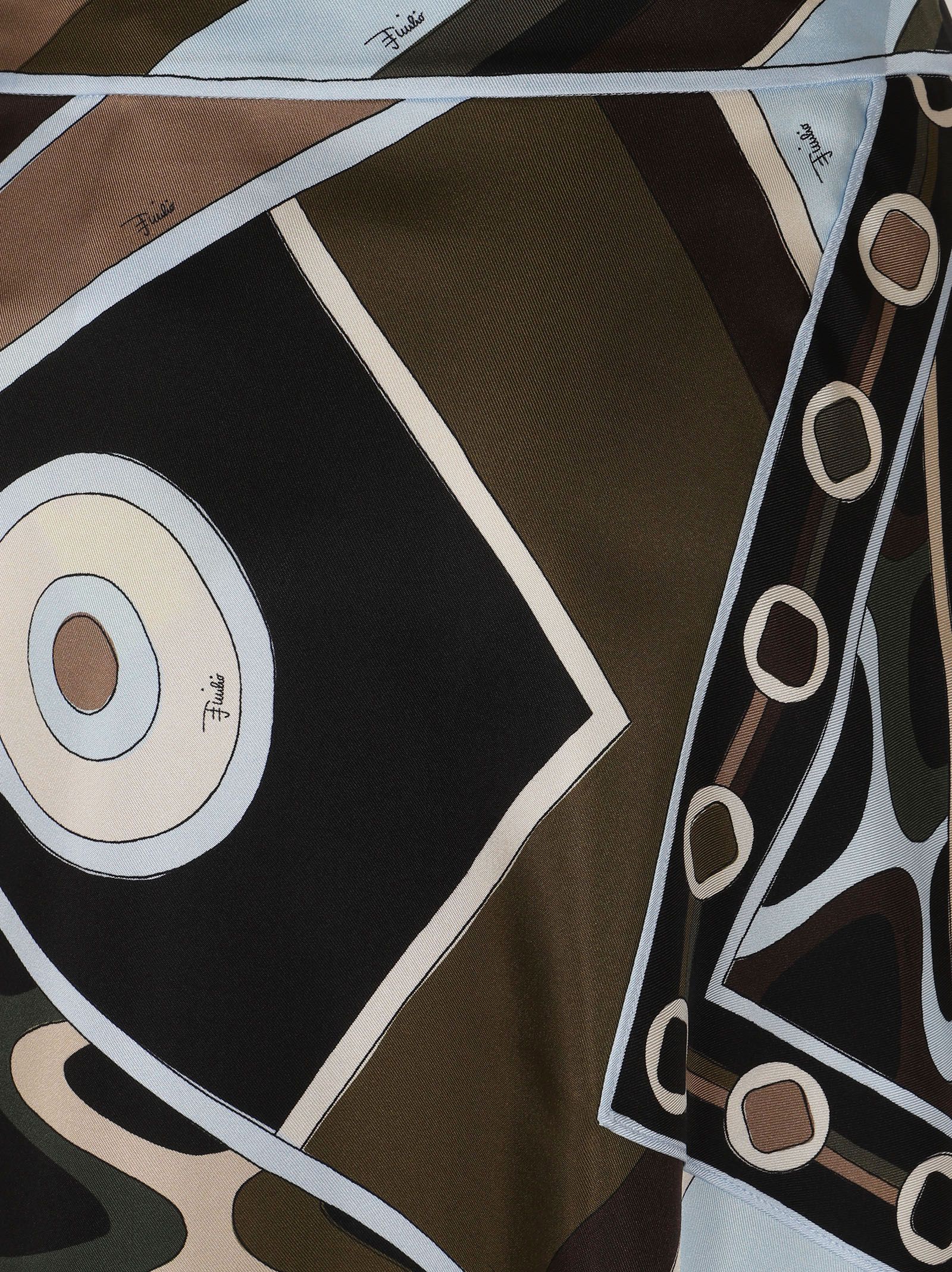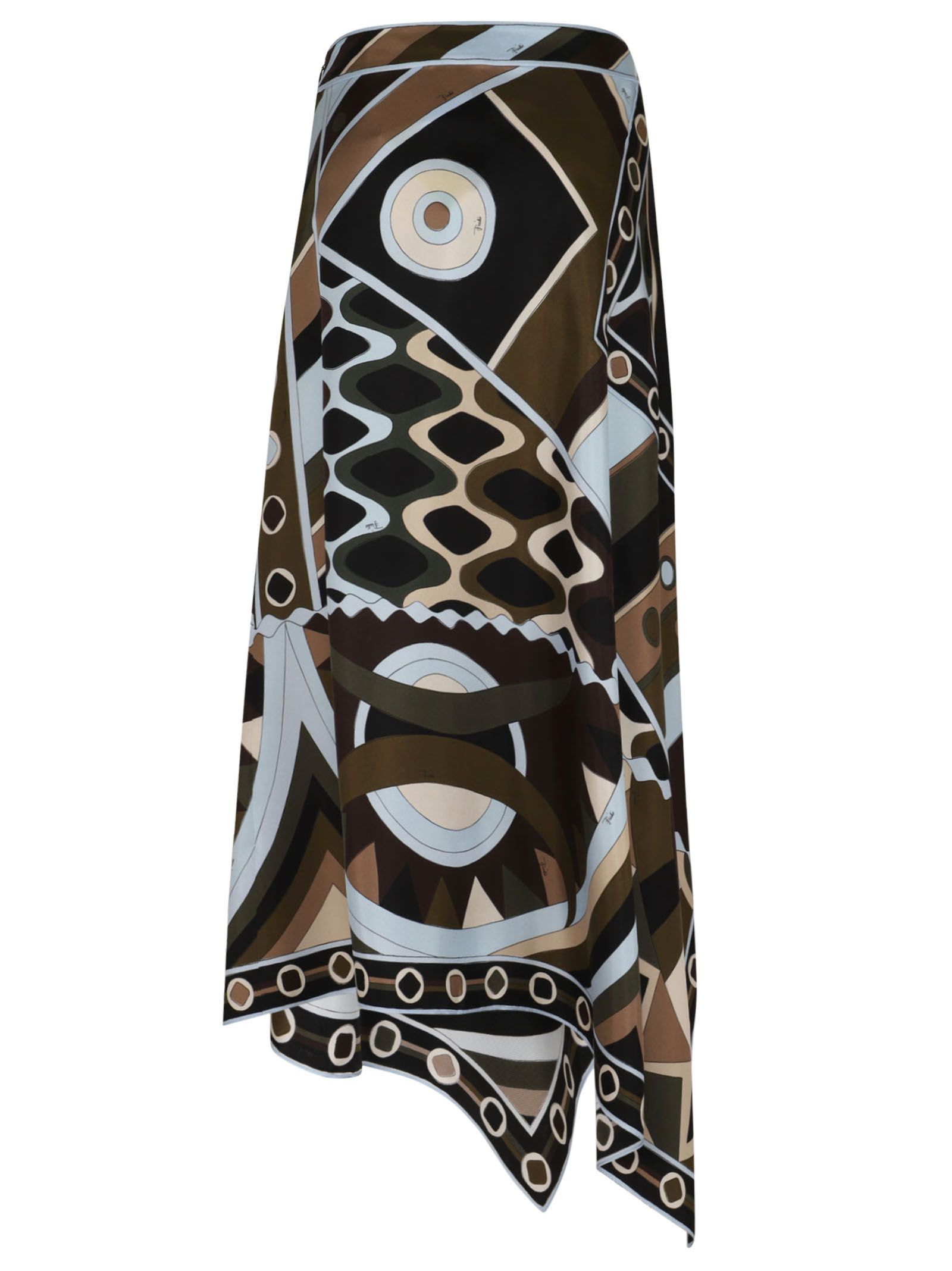 Gonna midi Vivara asimmetrica in twill di seta di Pucci. Caratterizzata dalla stampa Vivara con motivi grafici e linee fluide nei toni del marrone, kaki e azzurro.Realizzata in 100% seta (twill di seta).Presenta una costruzione asimmetrica che richiama l`estetica di un foulard, con chiusura a zip laterale nascosta.