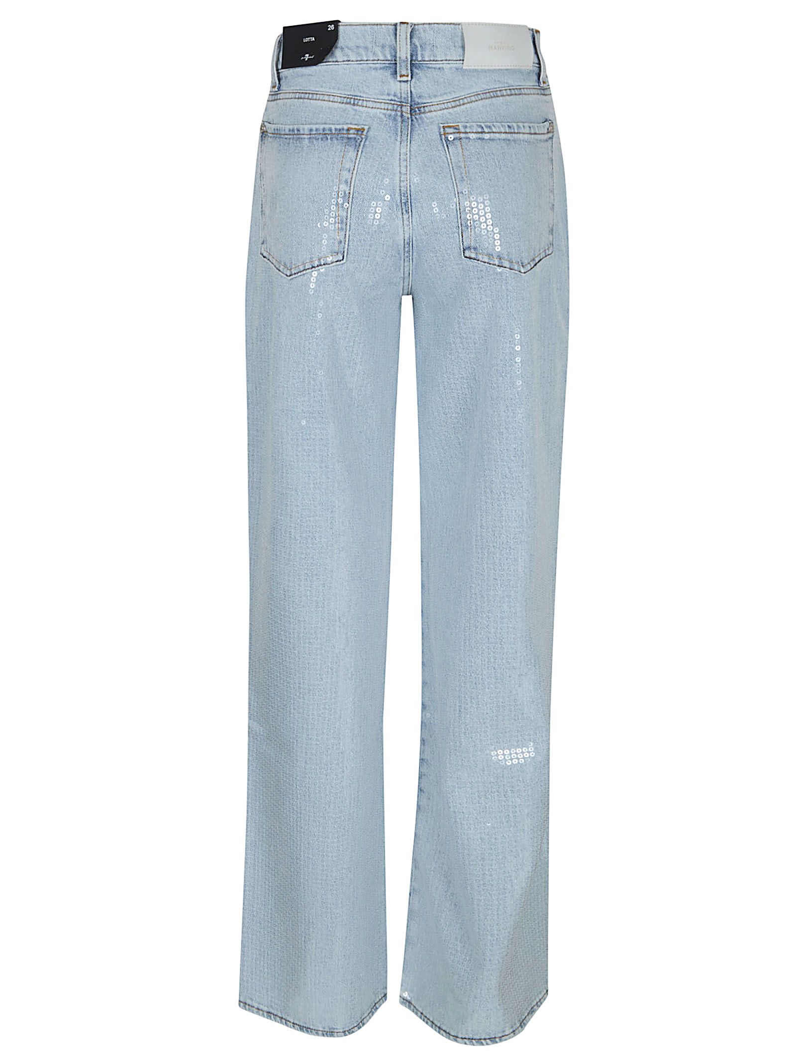 Jeans LOTTA in cotone elasticizzato di 7 FOR ALL MENKIND.Vita alta; chiusura con cerniera e bottone; cinque tasche.Vestibilità comoda, vita che segue contorni di vita e fianchi per aprirsi in una wide Leg.Impreziosito da paillettes tono su tono.