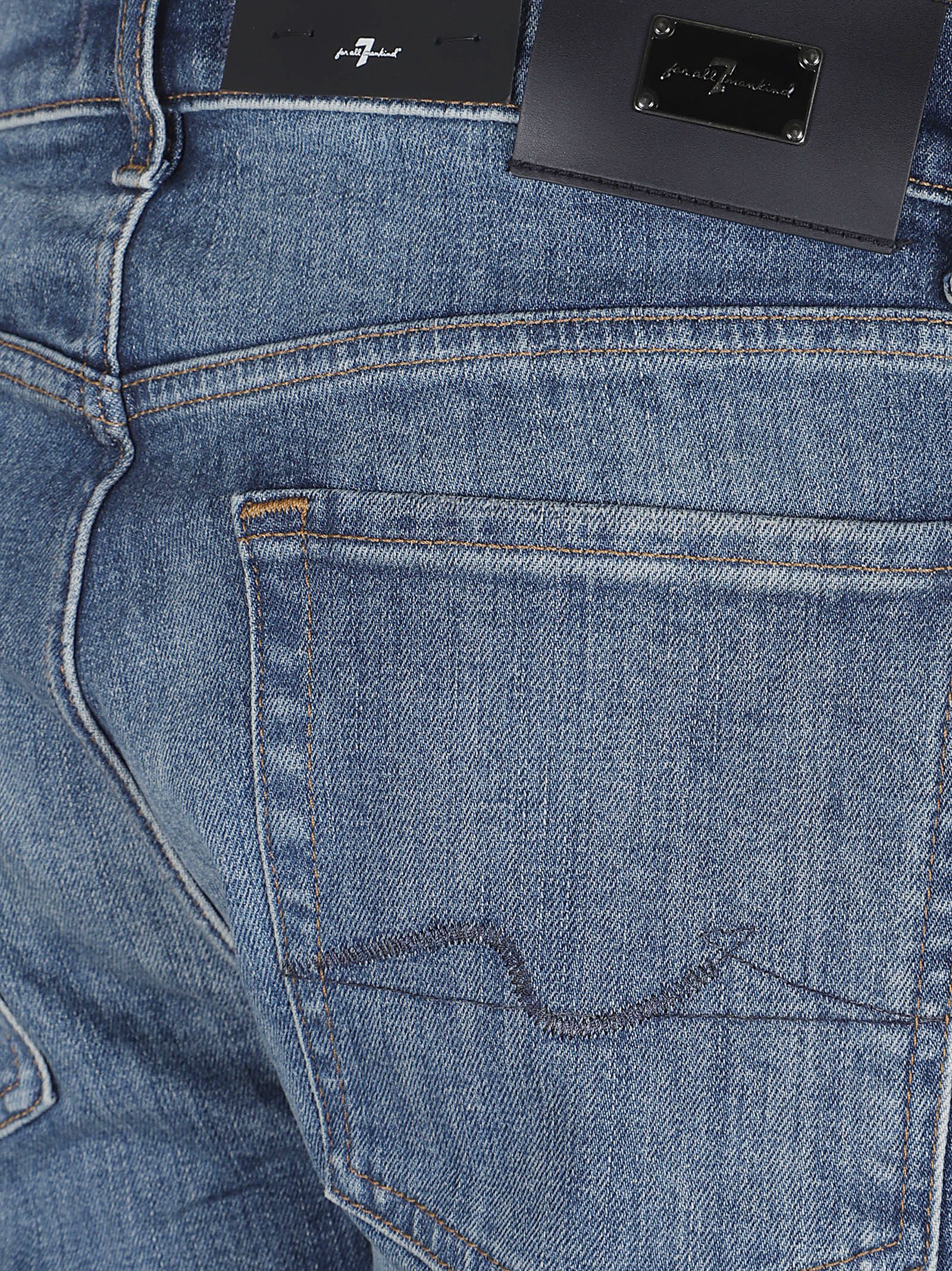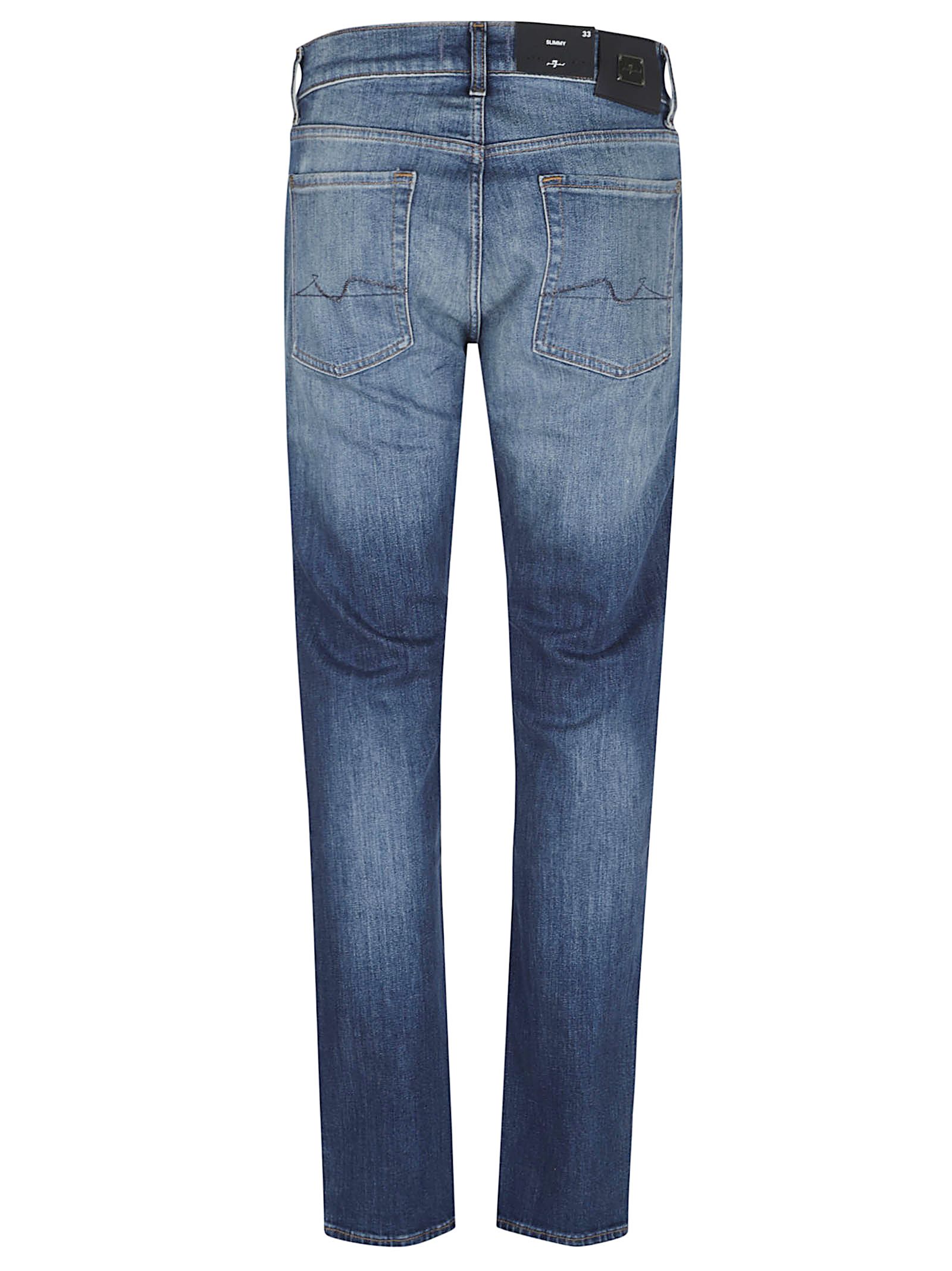 Jeans Slimmy in denim elasticizzato di 7 FOR ALL MENKIND.Vita media; chiusura con zip e bottone; passanti per cintura; modello cinque tasche; design vestibilità slim regular con fondo leggermente affusolato.