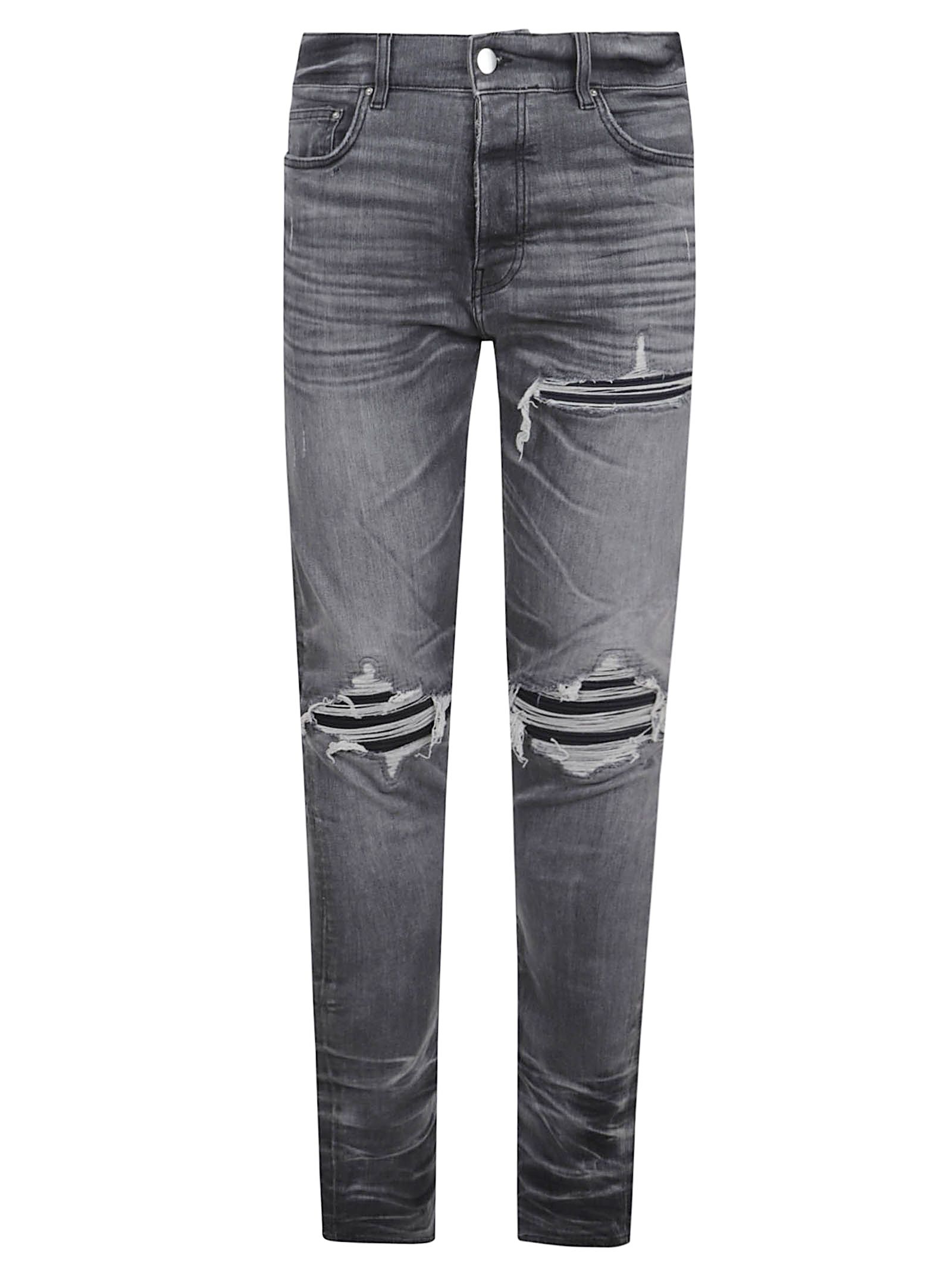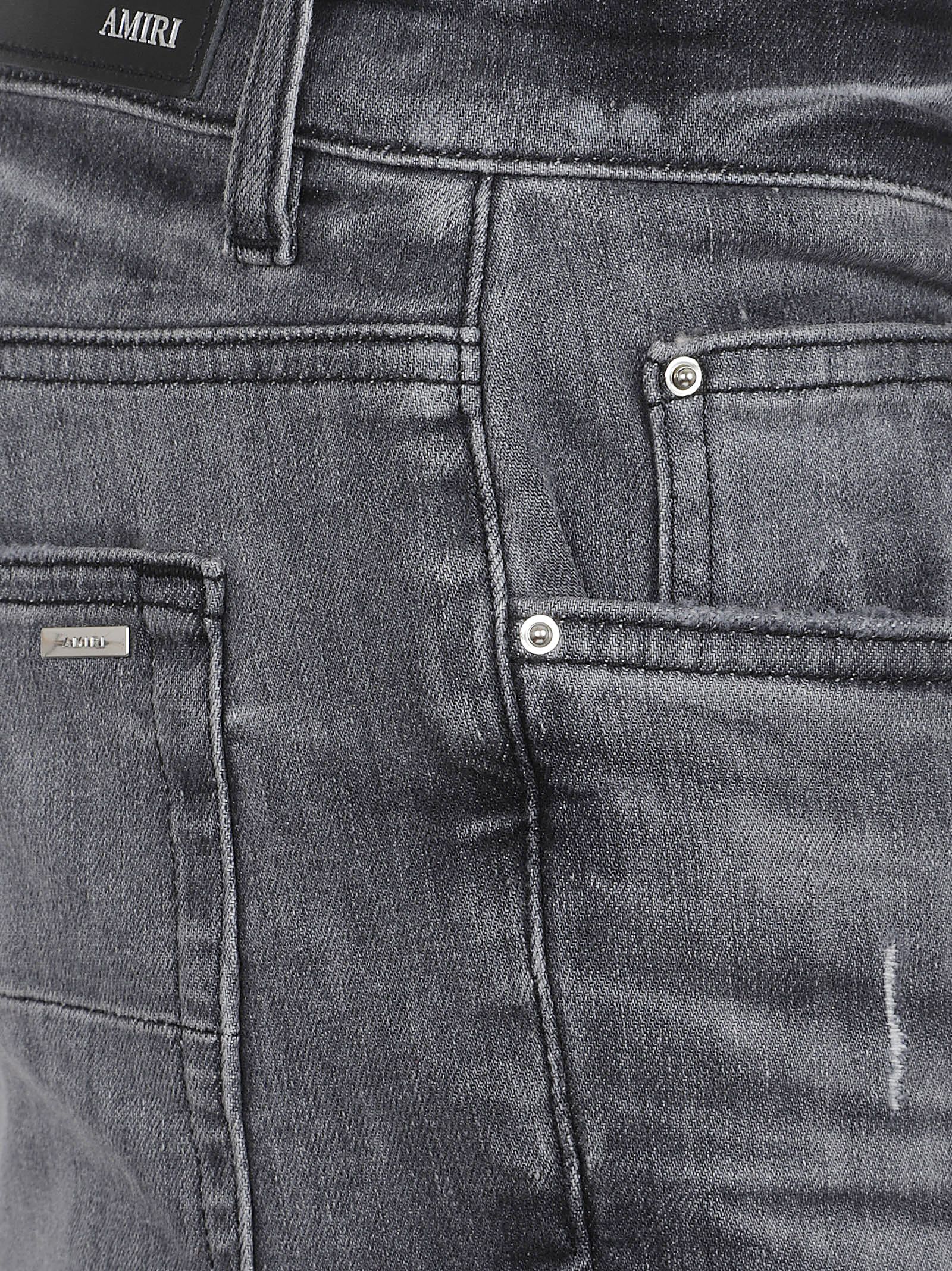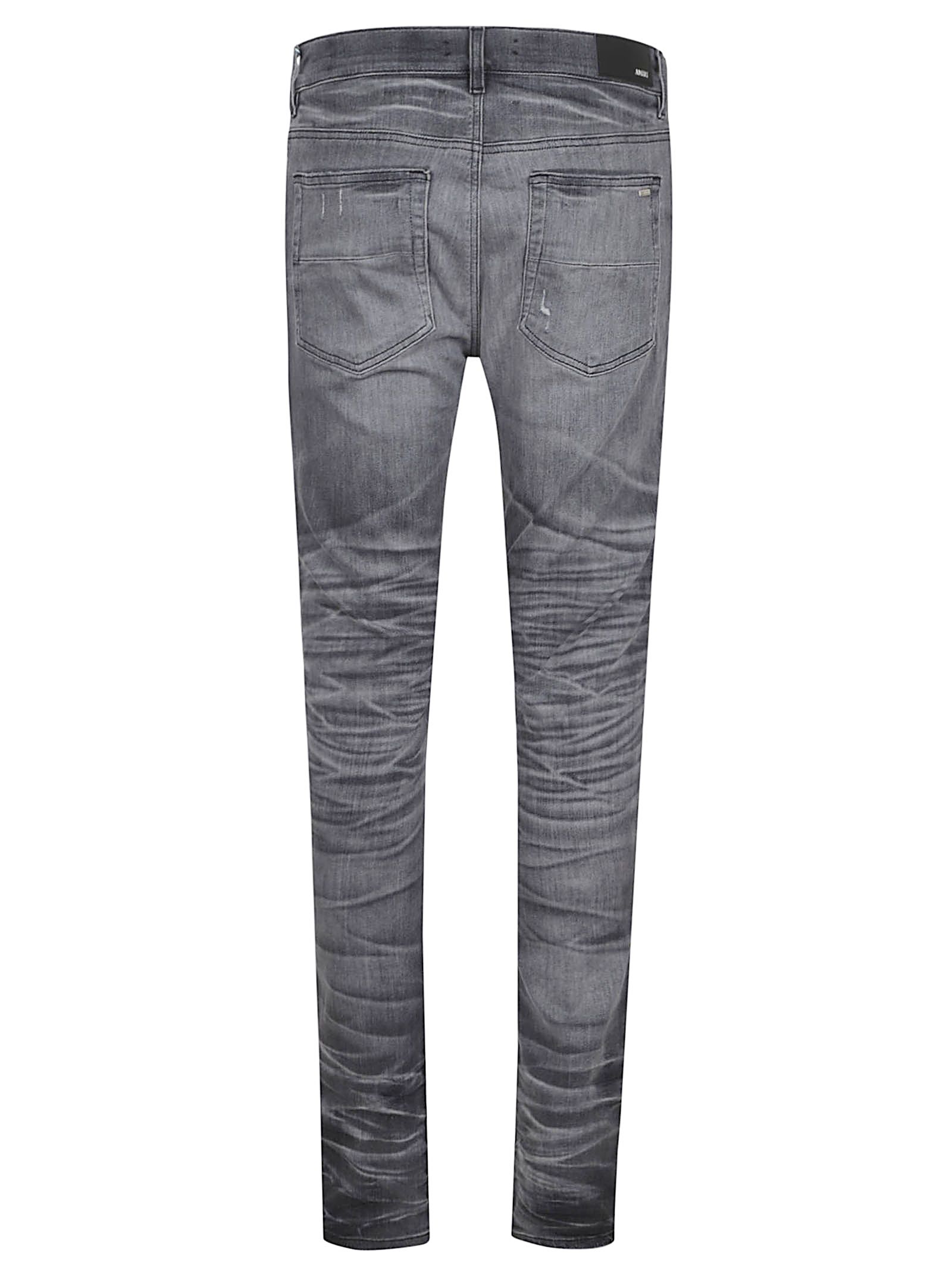 Jeans di Amiri, caratterizzato da chiusura frontale con bottoni e zip, colore grigio, cinque tasche classiche, dettagli strappati, toppa con logo sul retro