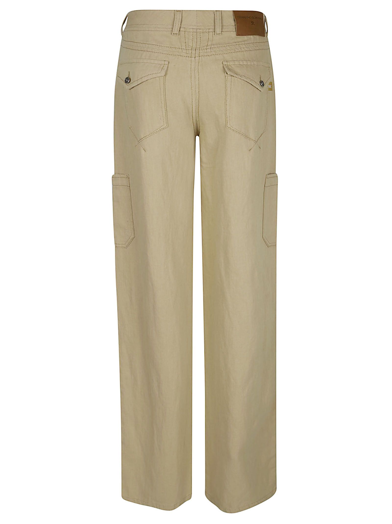 Pantaloni in denim leggero misto cotone e lino di ERMANNO SCERVINO.Chiusura con zip e bottone; passanti per cintura; design vestibilità morbida, taglio cargo con tasche laterali con bottoni a contrasto color argento.