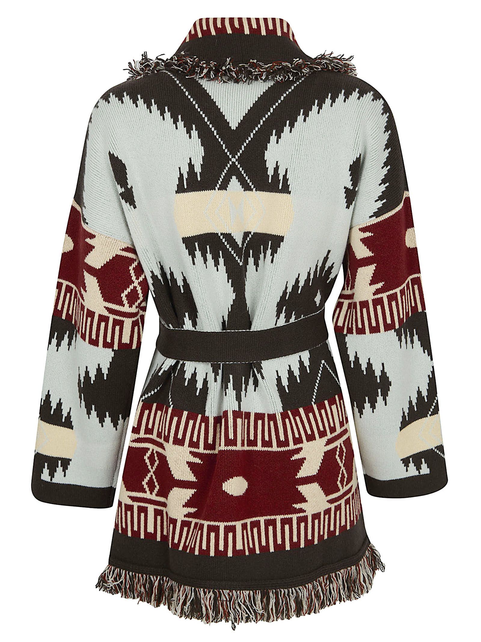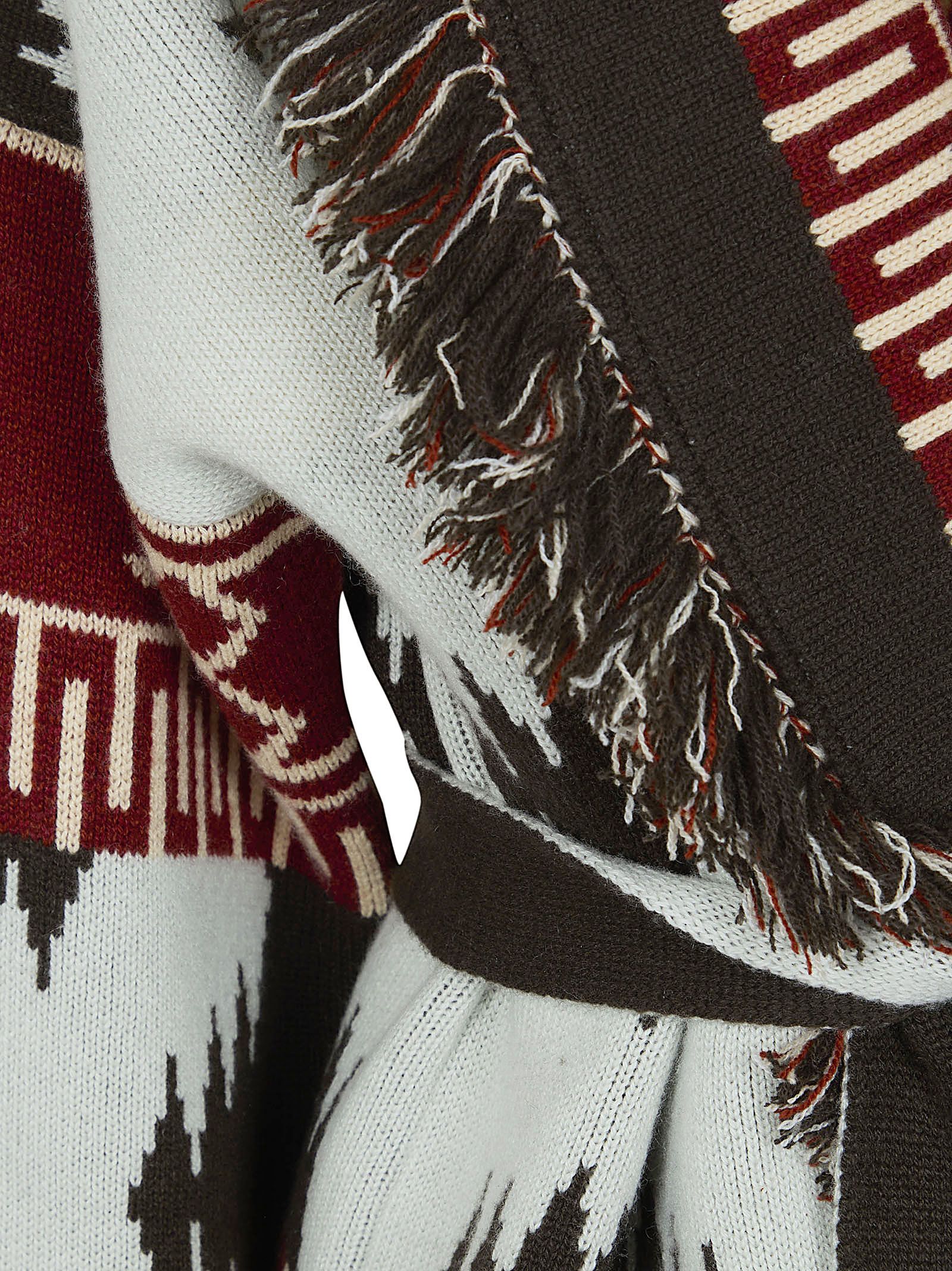 Cardigan in cashmere con un`intricata lavorazione a doppia maglia jacquard di ALANUI.Bordi con frange multicolor e cintura bicolore. Caratterizzato da motivo Icon.