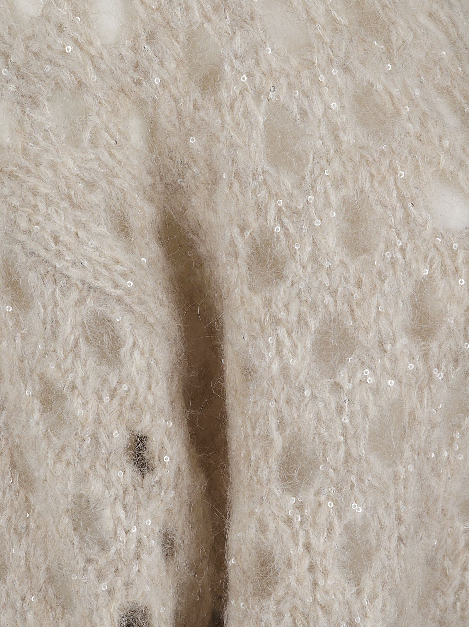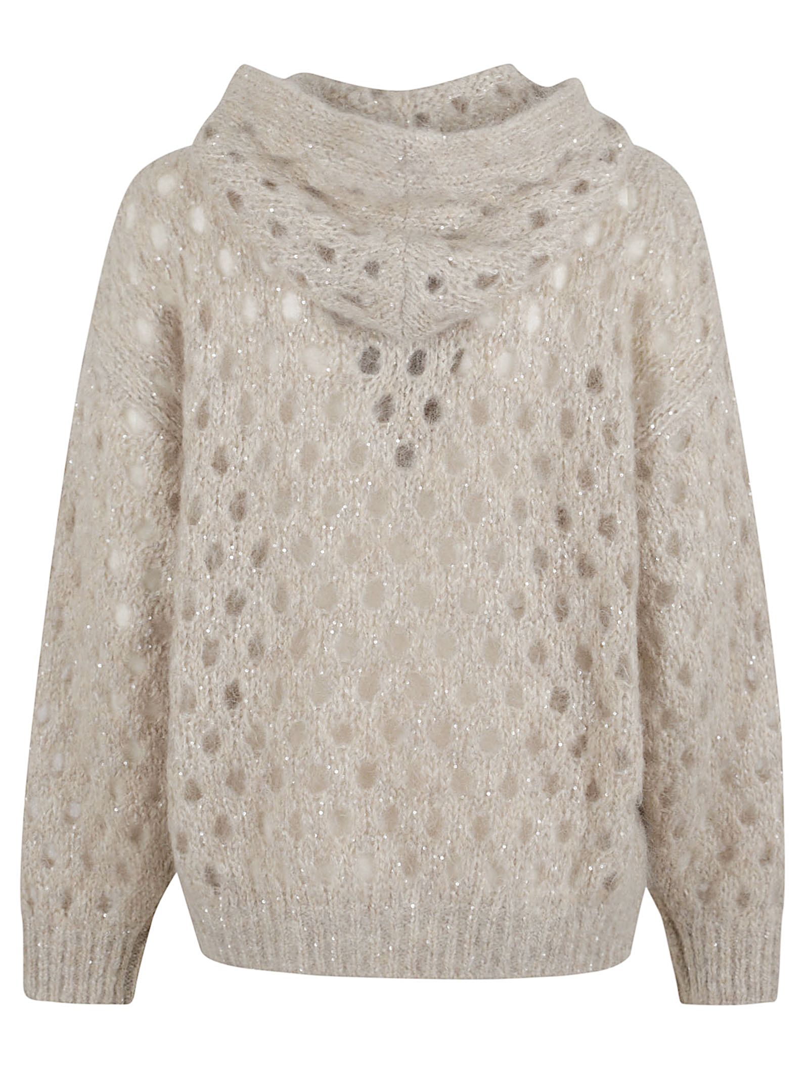 Cardigan Dazzling Net in mohair e lana Wispy di BRUNELLO CUCINELLI.Cappuccio; chiusura con zip; design vestibilità rilassata, spalle abbassare e maniche ampie.Caratterizzato da classico punto rete, con i suoi giochi di pieni e vuoti arricchiti da tocco brillante delle piccole paillettes.
