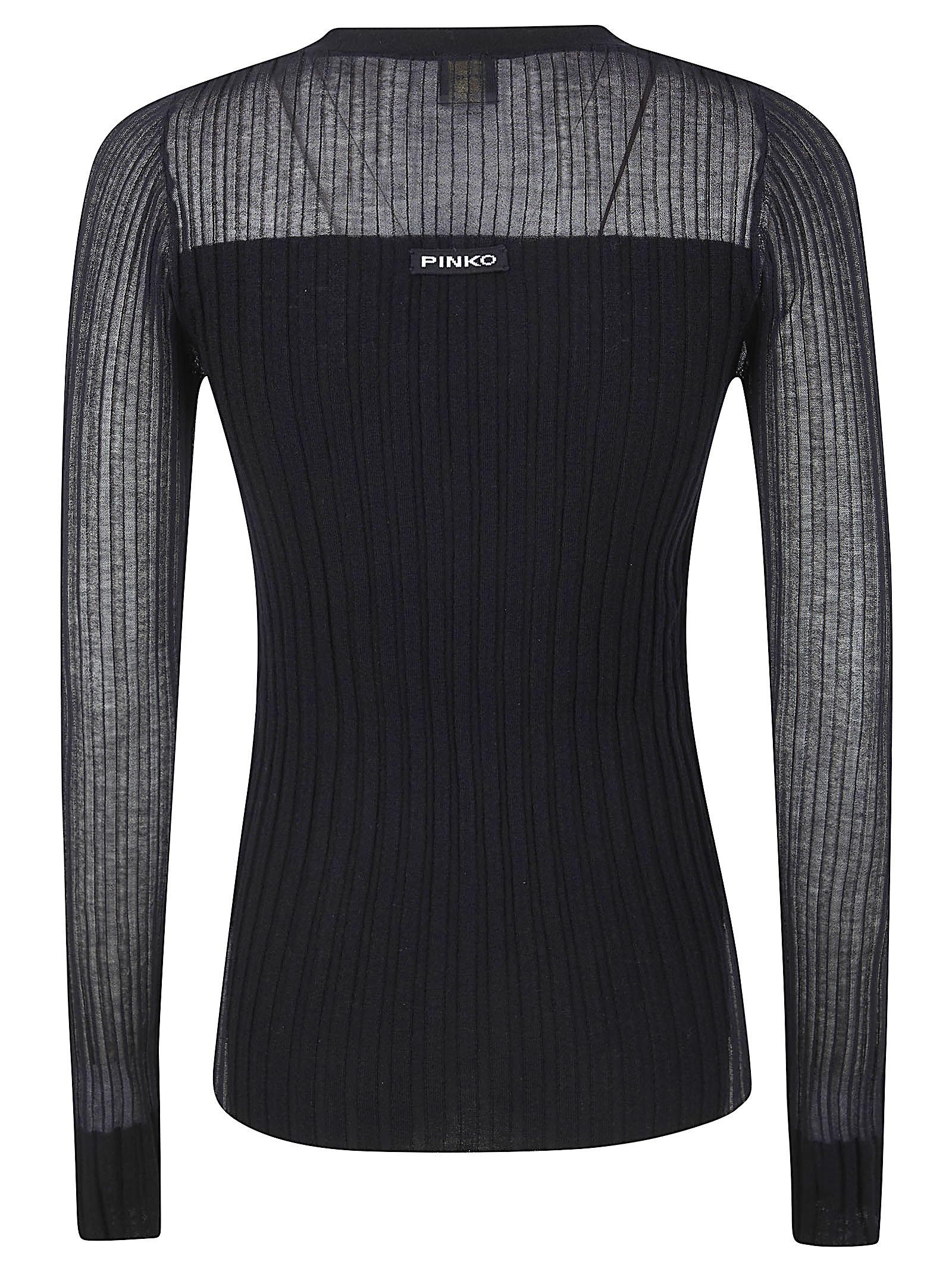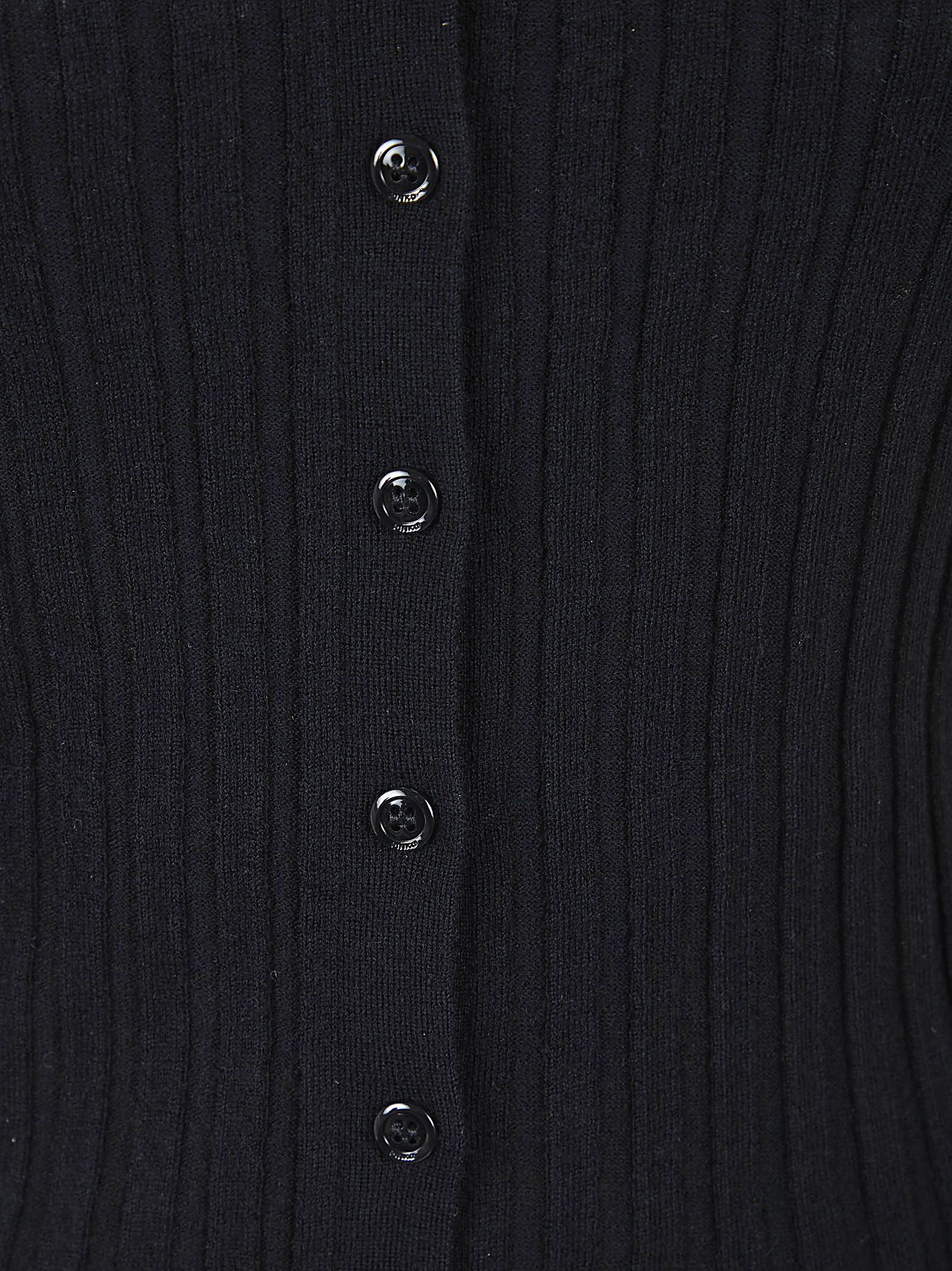 Cardigan in morbida e leggera maglia di misto lana, seta e cashmere, lavorato a coste di PINKO.Scollo a V; chiusura frontale con bottoni; design vestibilità aderente che segue le forme del corpo. Caratterizzato da etichetta con logo lettering PINKO in jacquard sul retro.