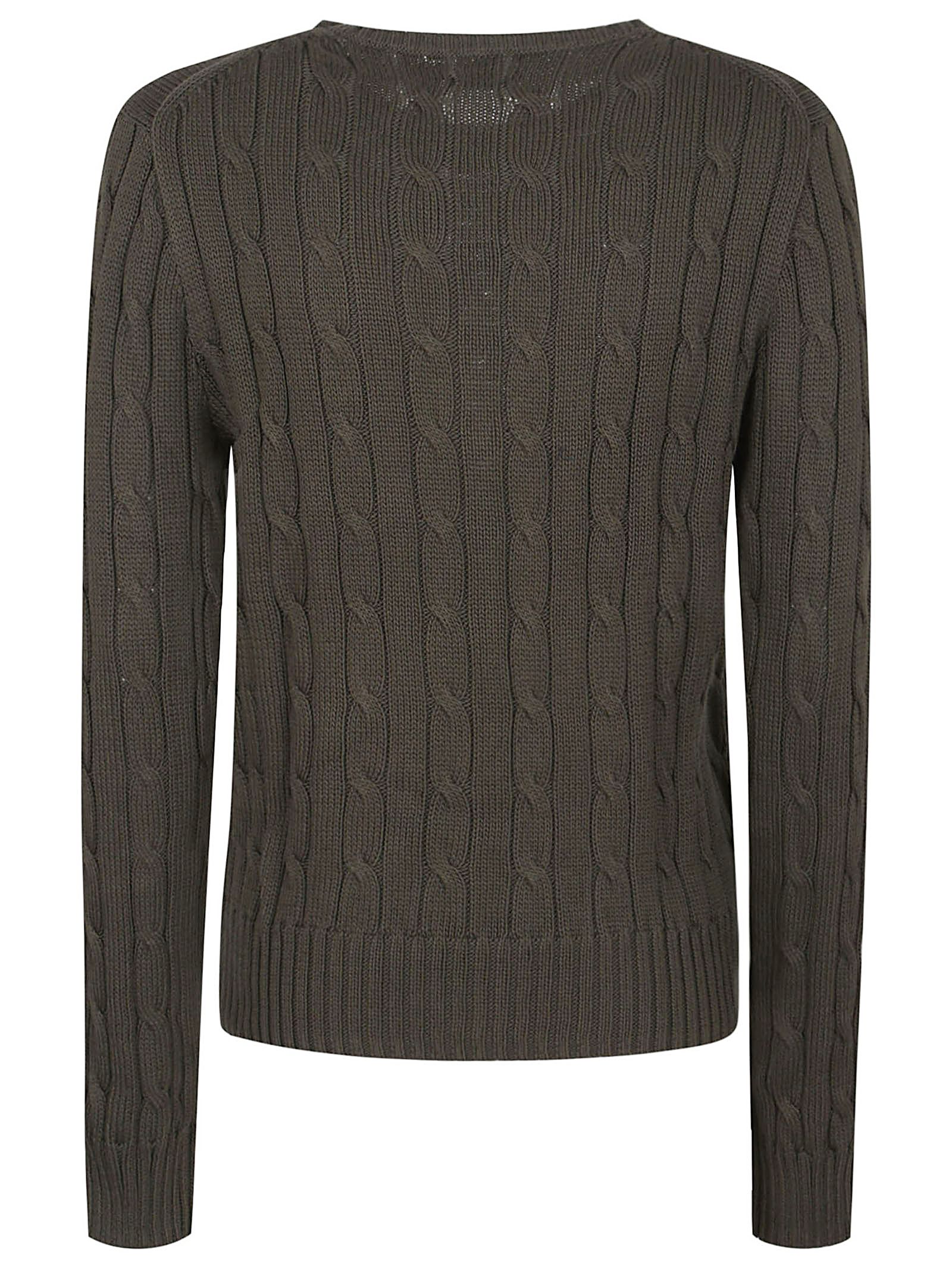 maglia a trecce, girocollo manica lunga bordini cavallino ricamato sul davanti