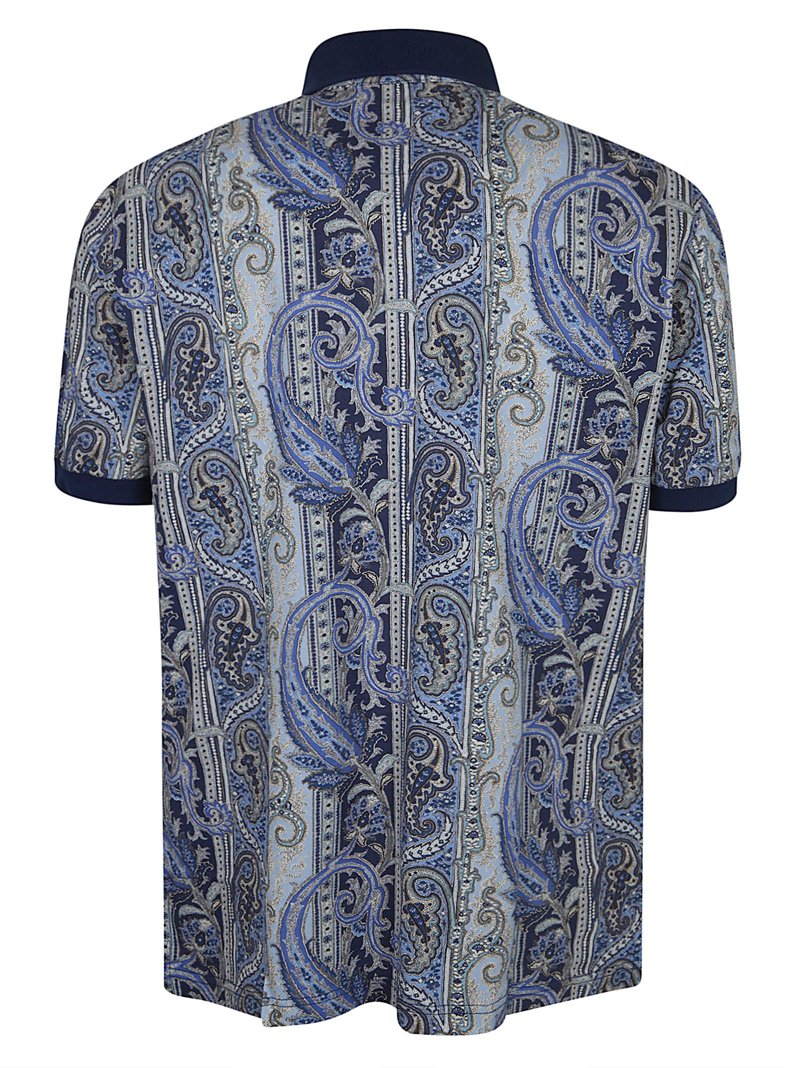 Polo in piquet di puro cotone di ETRO.Maniche corte; colletto a punta con tre bottoni; design vestibilità regolare. Caratterizzata da motivo Paisley stampato all over, piccolo ricamo Pegaso sul petto e colletto e fondo manica a contrasto.