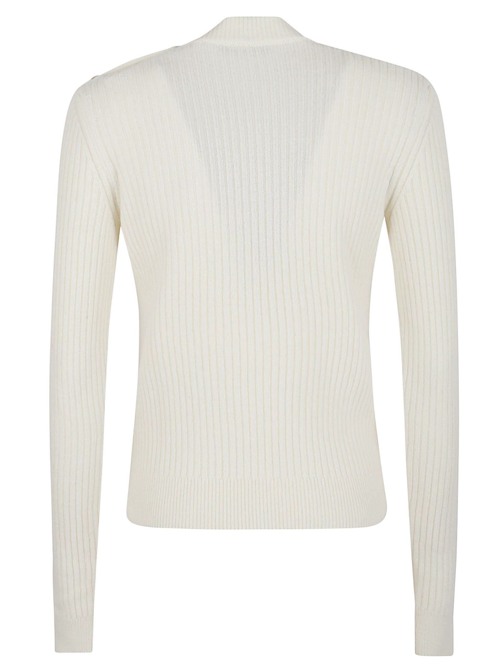 Maglione in misto cashmere di BALMAIN.Girocollo; maniche lunghe; motive a coste; design vestibilità aderente al corpo.Caratterizzato da bottoni con Logo presenti sulla spalla.