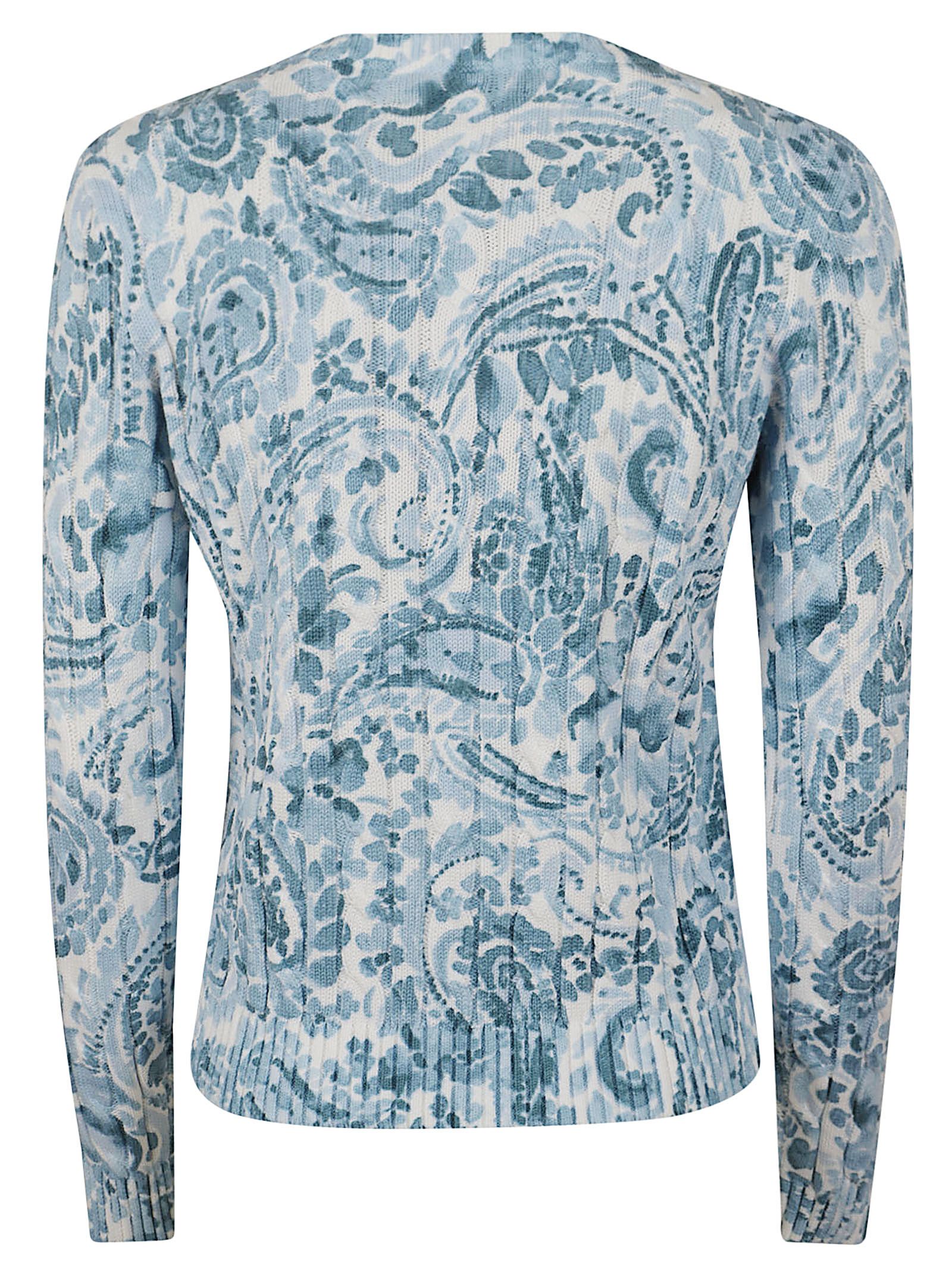Presenta una combinazione unica di una classica trama a treccia e un motivo paisley artistico stagionale nei toni del bianco e del blu.