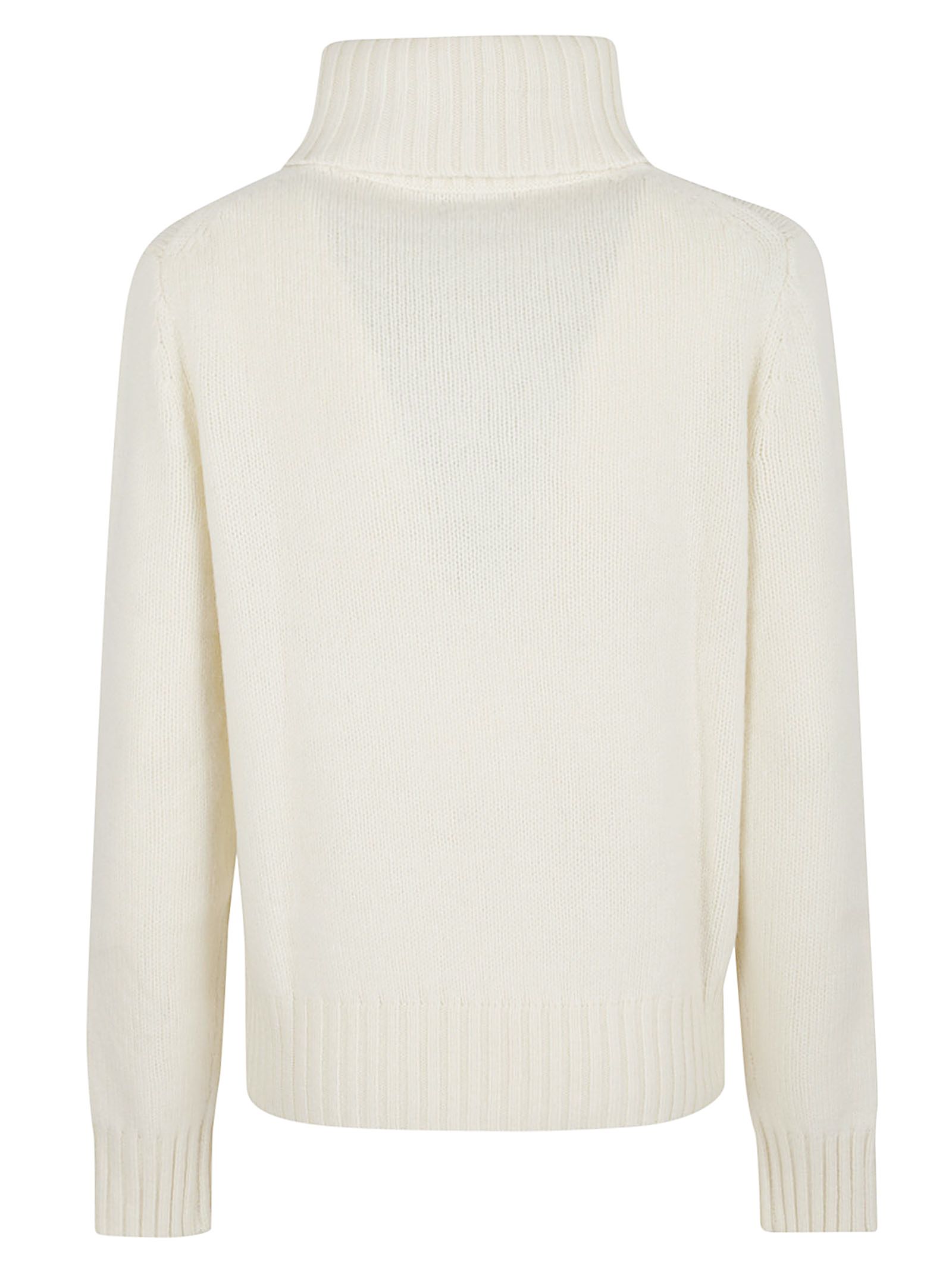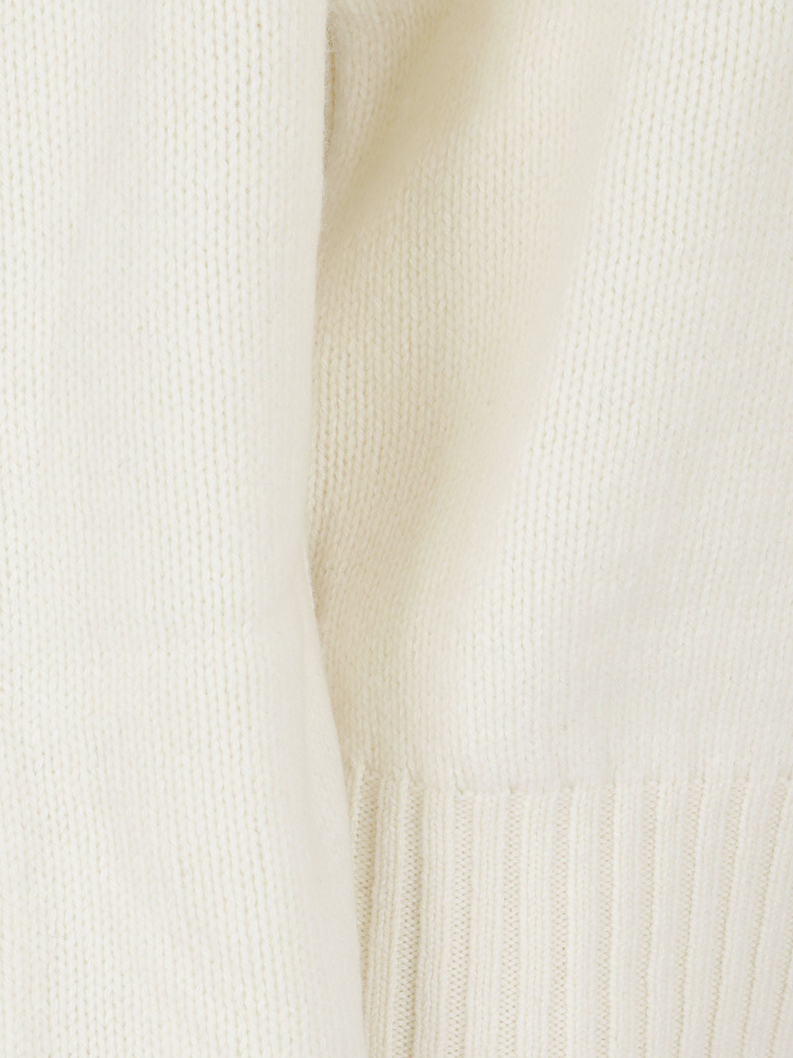 struttura in lana bianca lavorata a maglia, orlo a coste, collo alto, maniche lunghe, orlo dritto