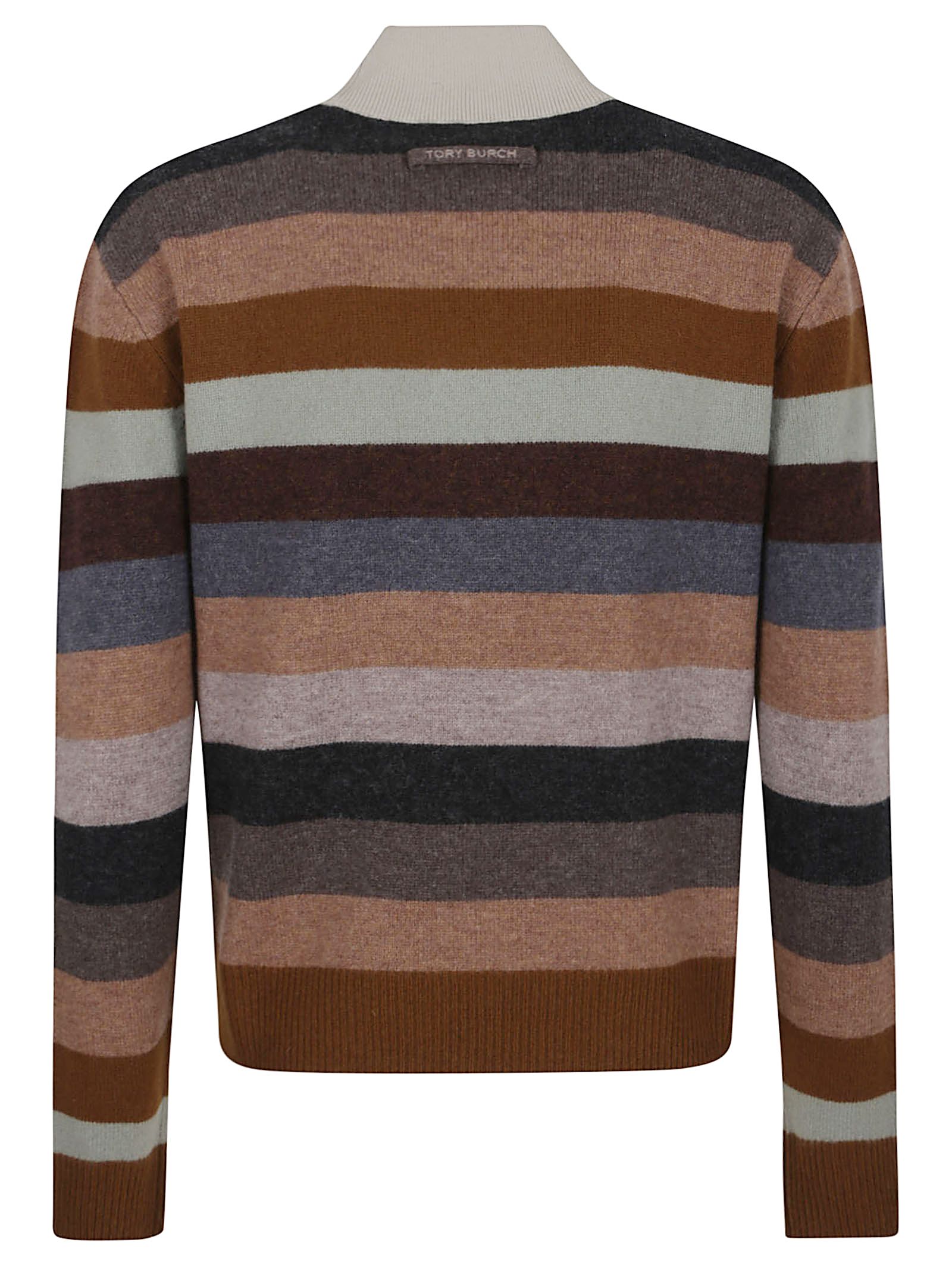 Dona un tocco caldo e raffinato al tuo guardaroba con questa maglia a righe in morbida lana, perfetta per la stagione fredda. Il design presenta un mix di tonalità naturali e terrose – tra cui caramello, beige, grigio, verde salvia e cioccolato – disposte in ampie righe orizzontali per un look moderno ma senza tempo.
