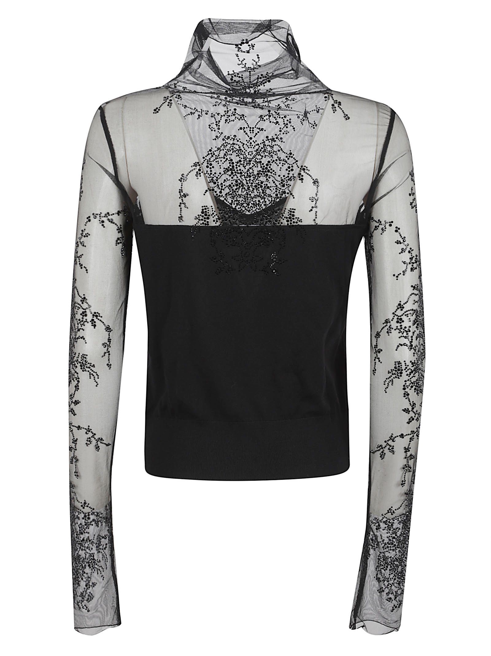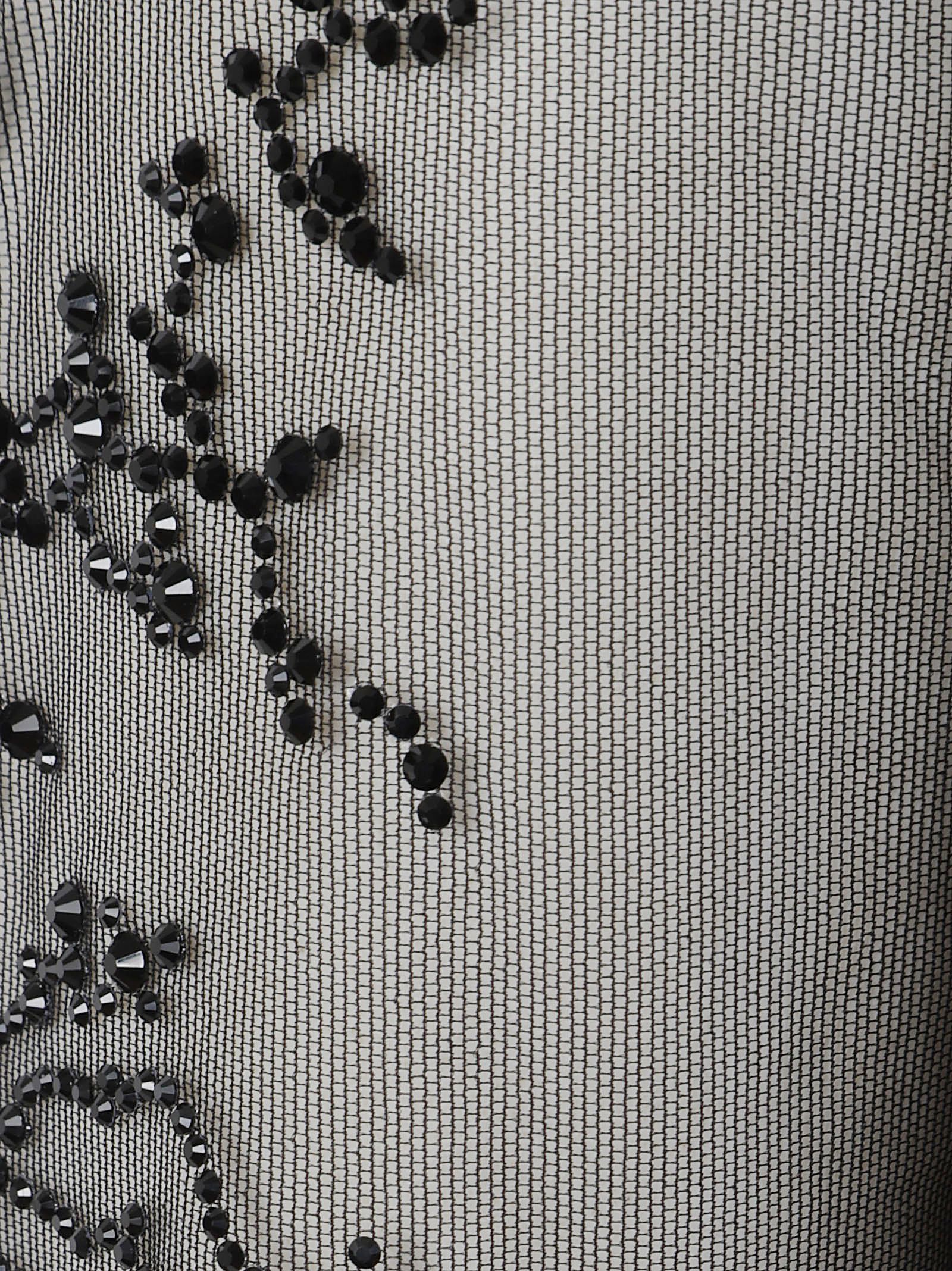 "collare a rotondo con lunghe maniche in tessuto trasparente e decorazione di perline nere"
