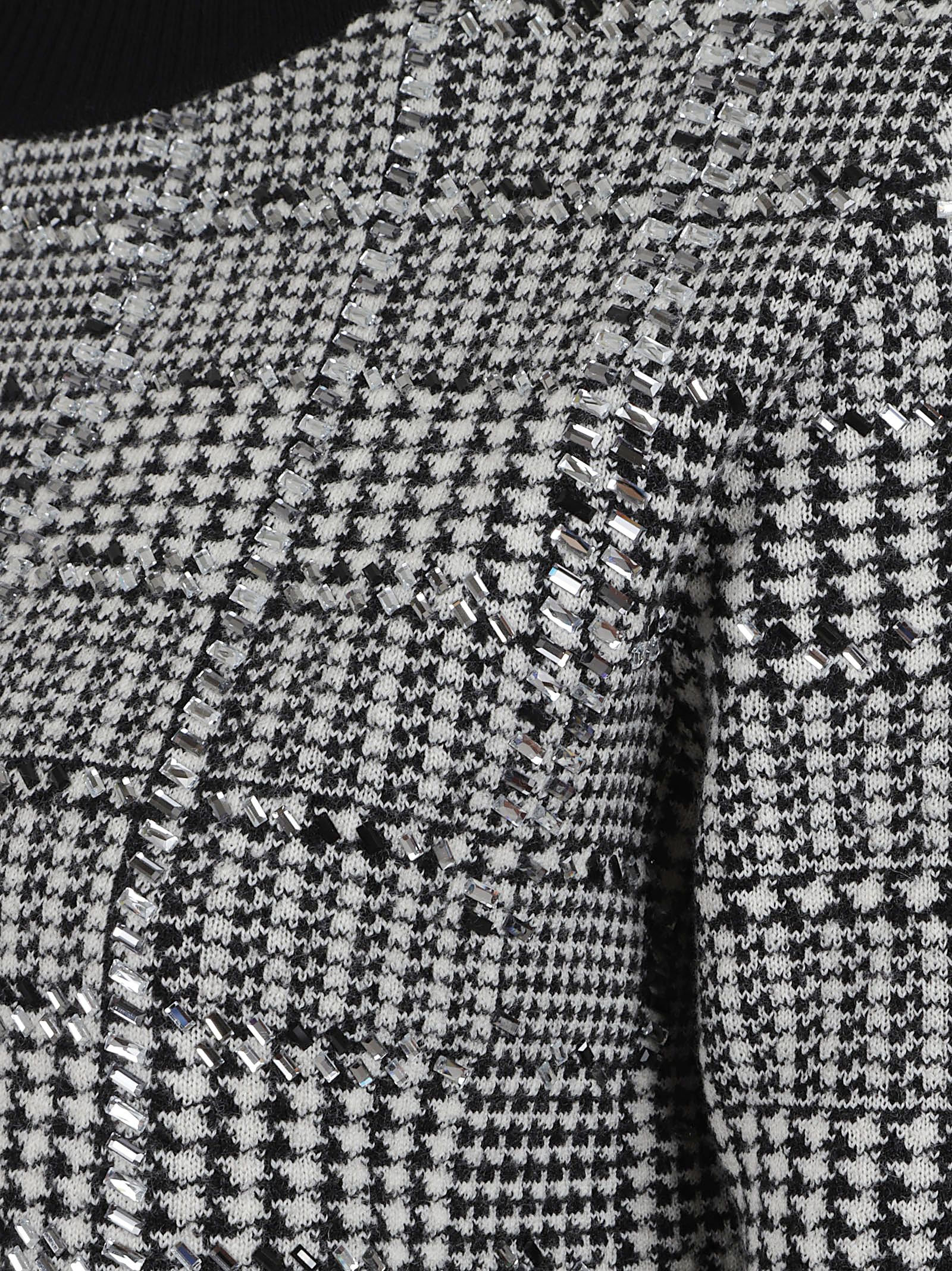 Maglia in misto lana di ERMANNO SCERVINO.Girocollo; manica 3/4; profili con elastico a costine; design vestibilità aderente, taglio crop. Caratterizzata da profili a contrasto e impreziosita da cristalli baguette.