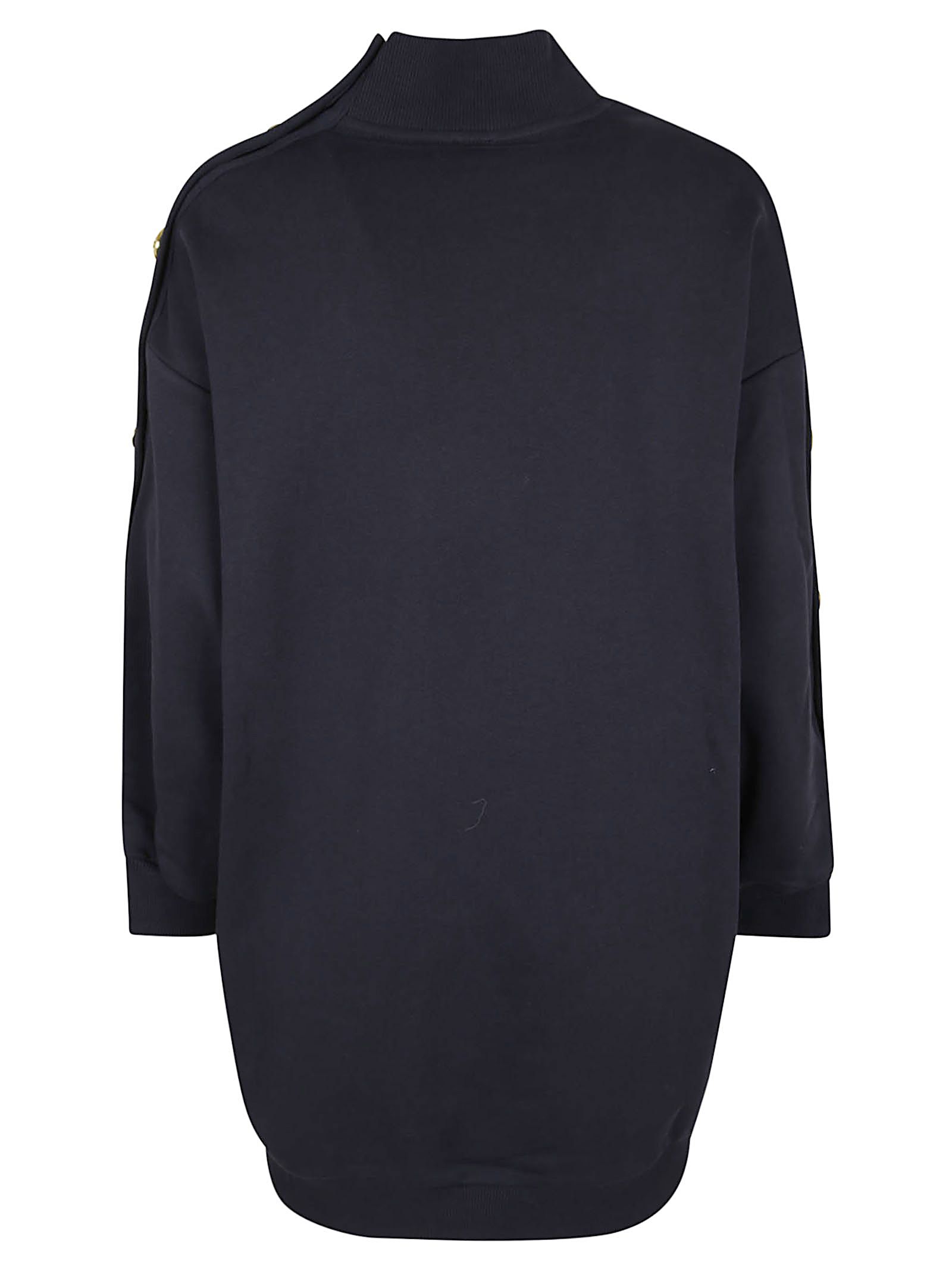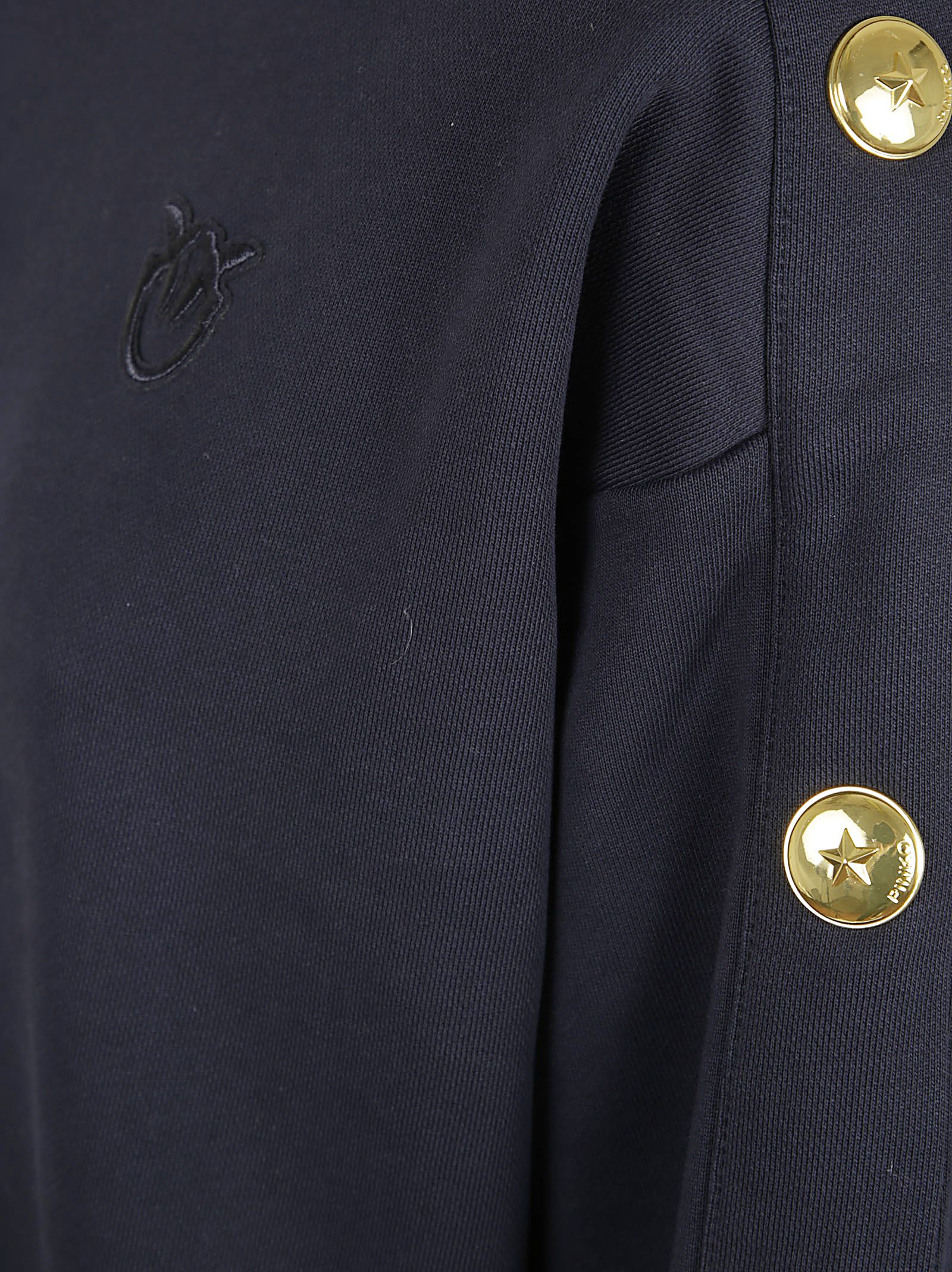 Maxi maglia in felpa di puro cotone di PINKO.Maniche lunghe; collo alto; polsi e fondo lavorati a costine; design vestibilità morbida che permette di indossala anche come abito corto.Caratterizzata da patch con logo Love Birds ricamato sul davanti lato cuore, e dai bottoni in metallo decorati da stella che profilano le maniche e l`apertura laterale del collo.