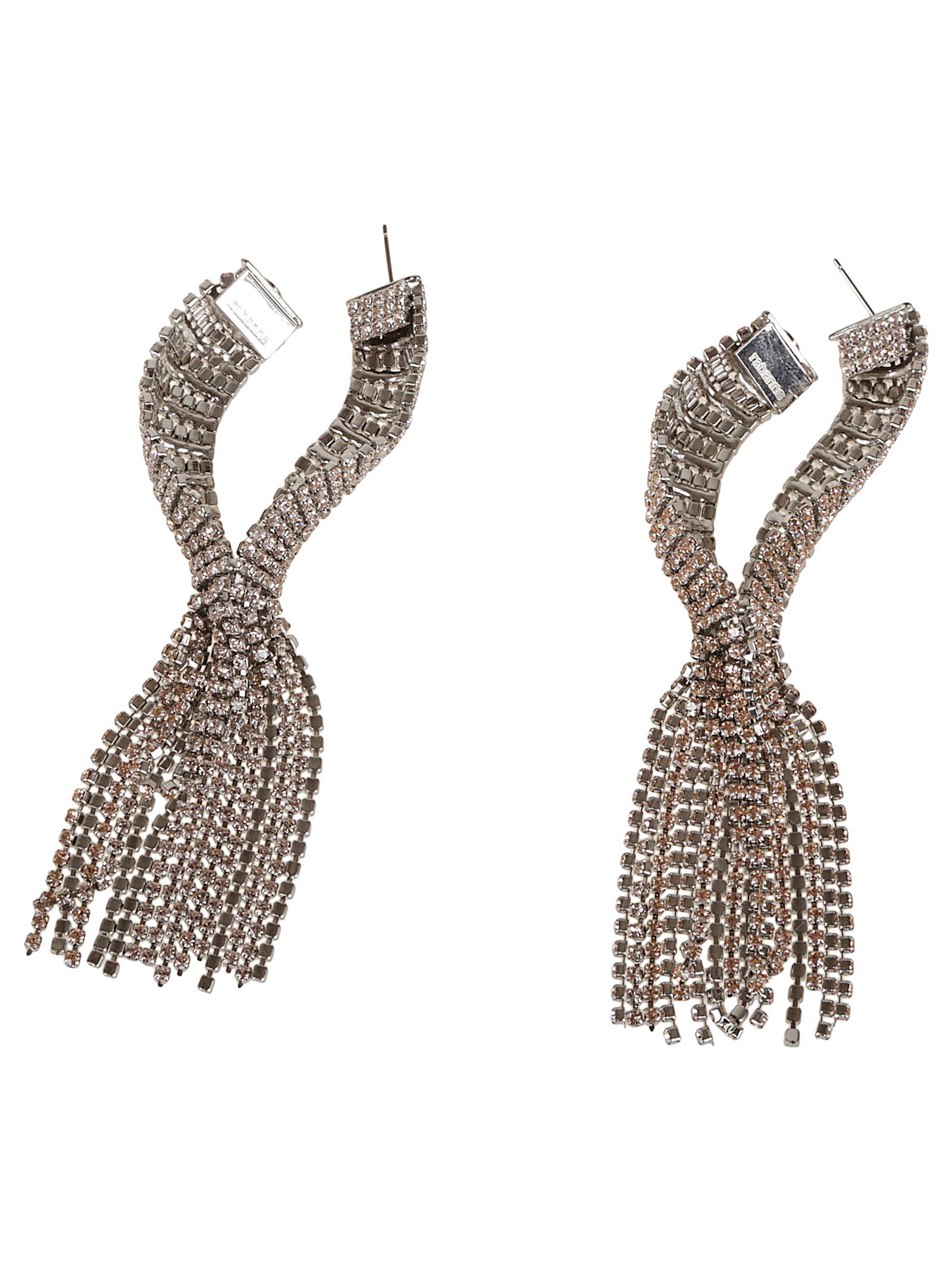 `Chiusura a moschettone argentato, dettagli frangiati, design a goccia. Questi orecchini sono venduti in coppia.`