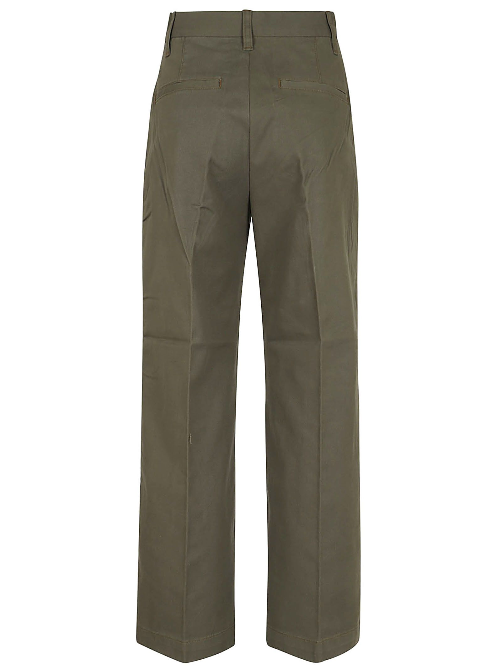 Pantalone misto cotone color kaki, passanti per cintura a vita alta, chiusura frontale con zip e bottone.Caratterizzato da due tasche laterali a fessura e due tasche a filetto posteriori.Gamba larga, lunghezza alla caviglia.