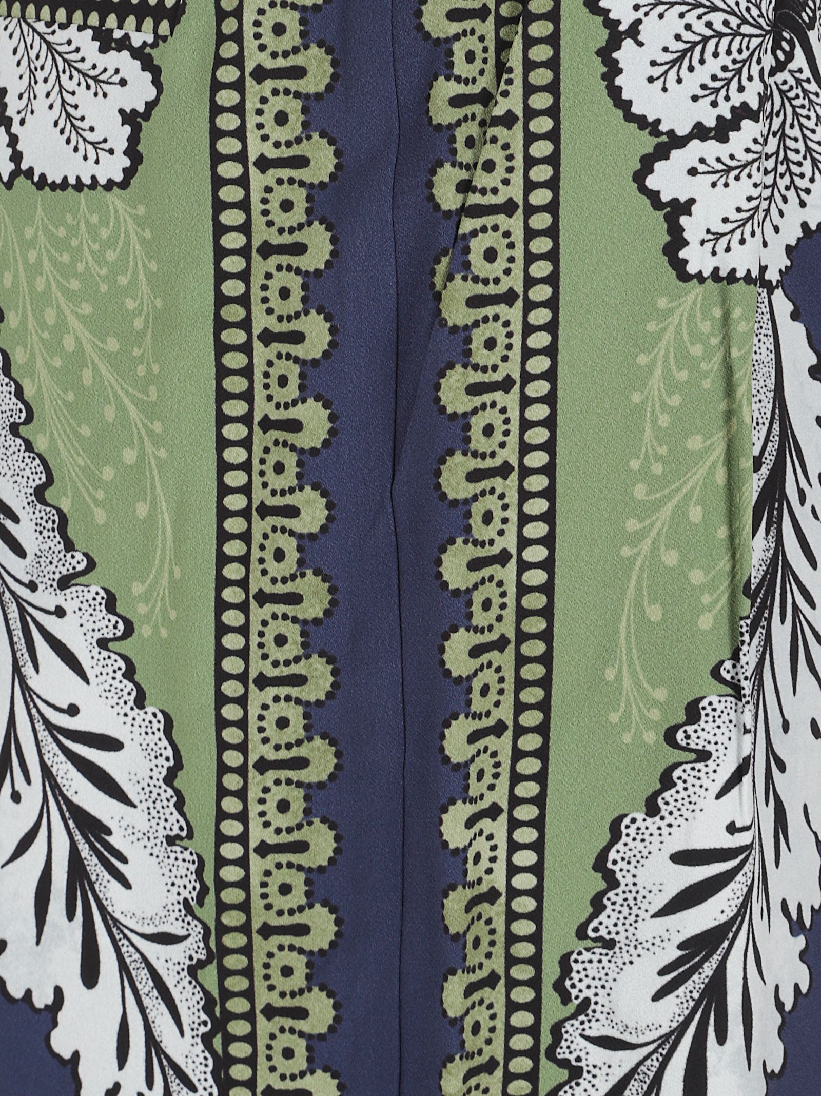 Blu navy motivo floreale fronte pieghettato pannelli laterali motivo di foglie verdi bordo geometrico color oro